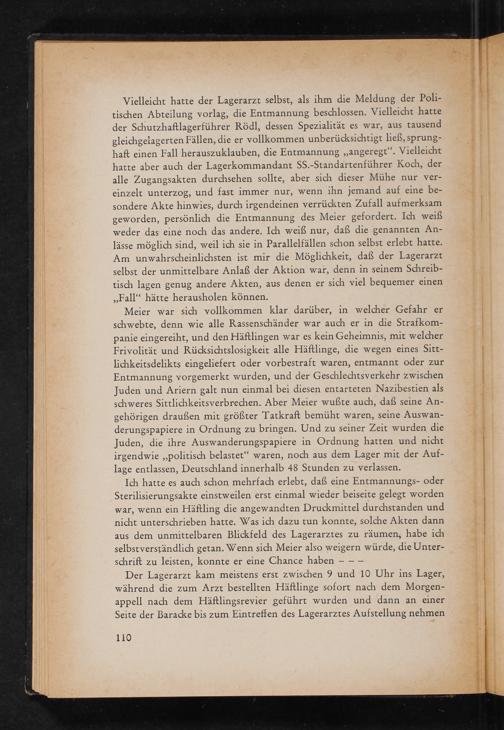 Vielleicht hatte der Lagerarzt selbst, als ihm die Meldung der Politischen Abteilung vorlag, die Entmannung beschlossen. Vielleicht hatte der Schutzhaftlagerführer Rödl, dessen Spezialität es war, aus tausend gleichgelagerten Fällen, die er vollkommen unberücksichtigt ließ, sprunghaft einen Fall herauszuklauben, die Entmannung ,, angeregt". Vielleicht hatte aber auch der Lagerkommandant SS.- Standartenführer Koch, der alle Zugangsakten durchsehen sollte, aber sich dieser Mühe nur vereinzelt unterzog, und fast immer nur, wenn ihn jemand auf eine besondere Akte hinwies, durch irgendeinen verrückten Zufall aufmerksam geworden, persönlich die Entmannung des Meier gefordert. Ich weiß weder das eine noch das andere. Ich weiß nur, daß die genannten Anlässe möglich sind, weil ich sie in Parallelfällen schon selbst erlebt hatte. Am unwahrscheinlichsten ist mir die Möglichkeit, daß der Lagerarzt selbst der unmittelbare Anlaß der Aktion war, denn in seinem Schreibtisch lagen genug andere Akten, aus denen er sich viel bequemer einen ,, Fall" hätte herausholen können.