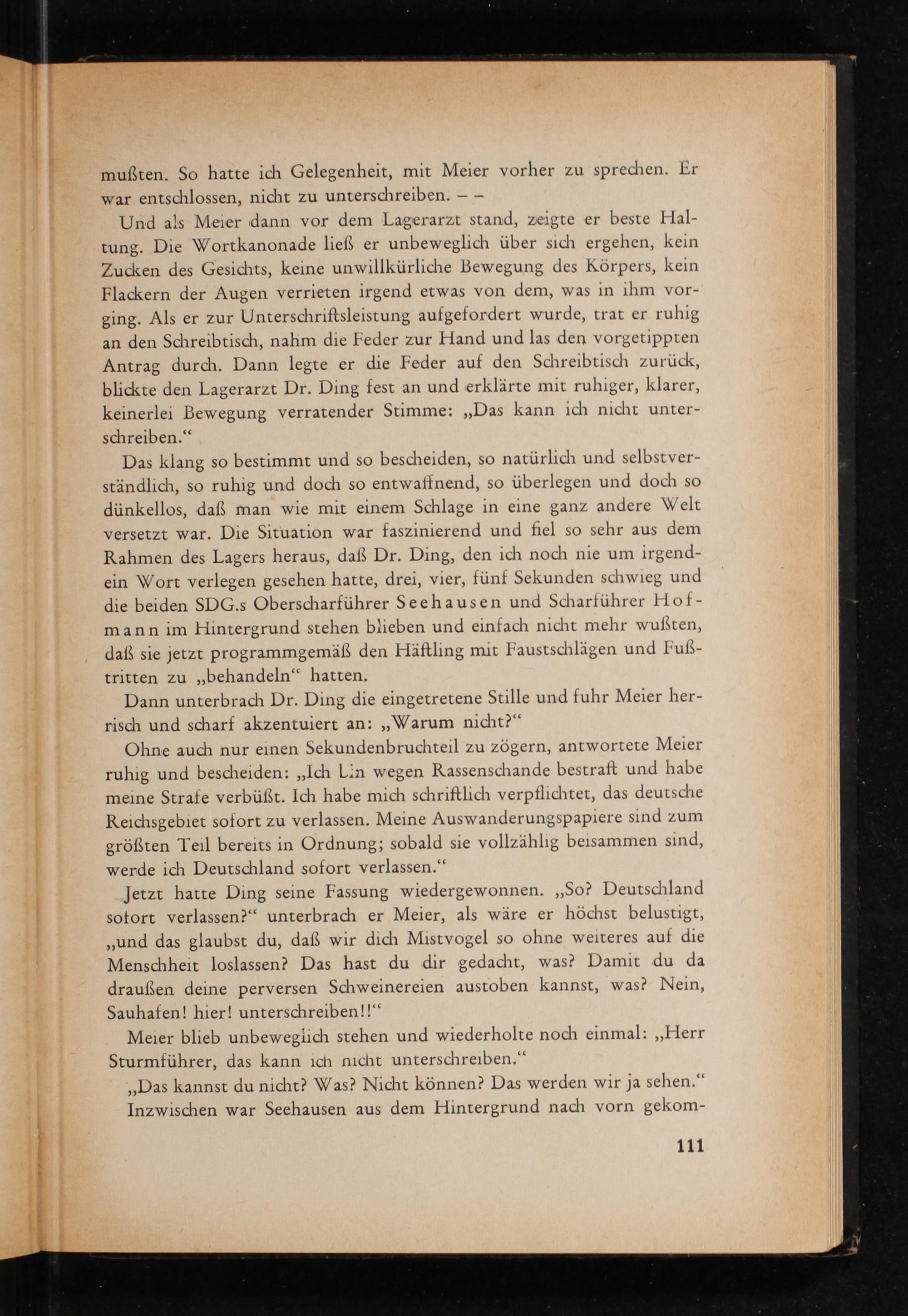 Und als Meier dann vor dem Lagerarzt stand, zeigte er beste Haltung. Die Wortkanonade ließ er unbeweglich über sich ergehen, kein Zucken des Gesichts, keine unwillkürliche Bewegung des Körpers, kein Flackern der Augen verrieten irgend etwas von dem, was in ihm vorging. Als er zur Unterschriftsleistung aufgefordert wurde, trat er ruhig an den Schreibtisch, nahm die Feder zur Hand und las den vorgetippten Antrag durch. Dann legte er die Feder auf den Schreibtisch zurück, blickte den Lagerarzt Dr. Ding fest an und erklärte mit ruhiger, klarer, keinerlei Bewegung verratender Stimme: ,, Das kann ich nicht unterschreiben."