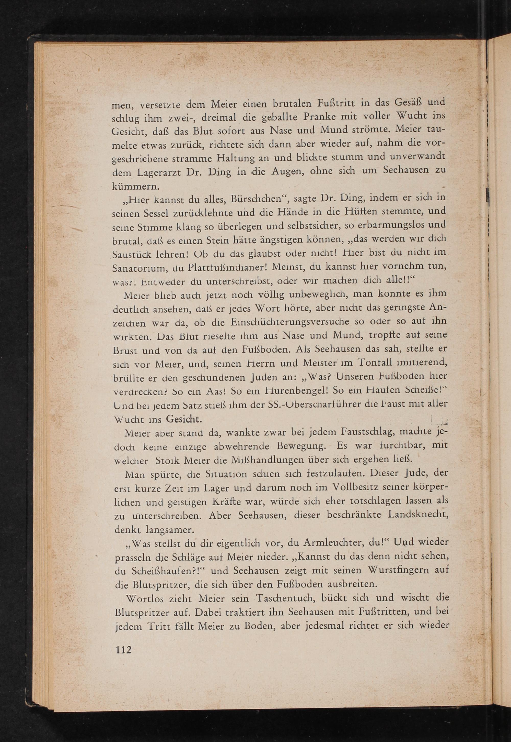 men, versetzte dem Meier einen brutalen Fußtritt in das Gesäß und schlug ihm zwei-, dreimal die geballte Pranke mit voller Wucht ins Gesicht, daß das Blut sofort aus Nase und Mund strömte. Meier taumelte etwas zurück, richtete sich dann aber wieder auf, nahm die vorgeschriebene stramme Haltung an und blickte stumm und unverwandt dem Lagerarzt Dr. Ding in die Augen, ohne sich um Seehausen zu kümmern.