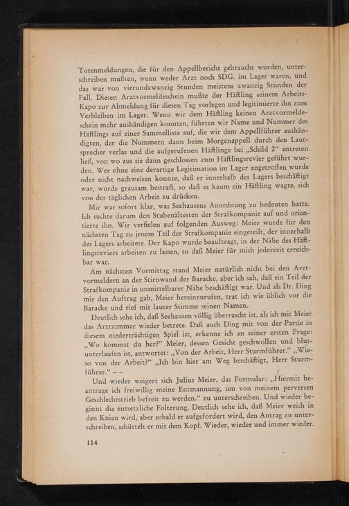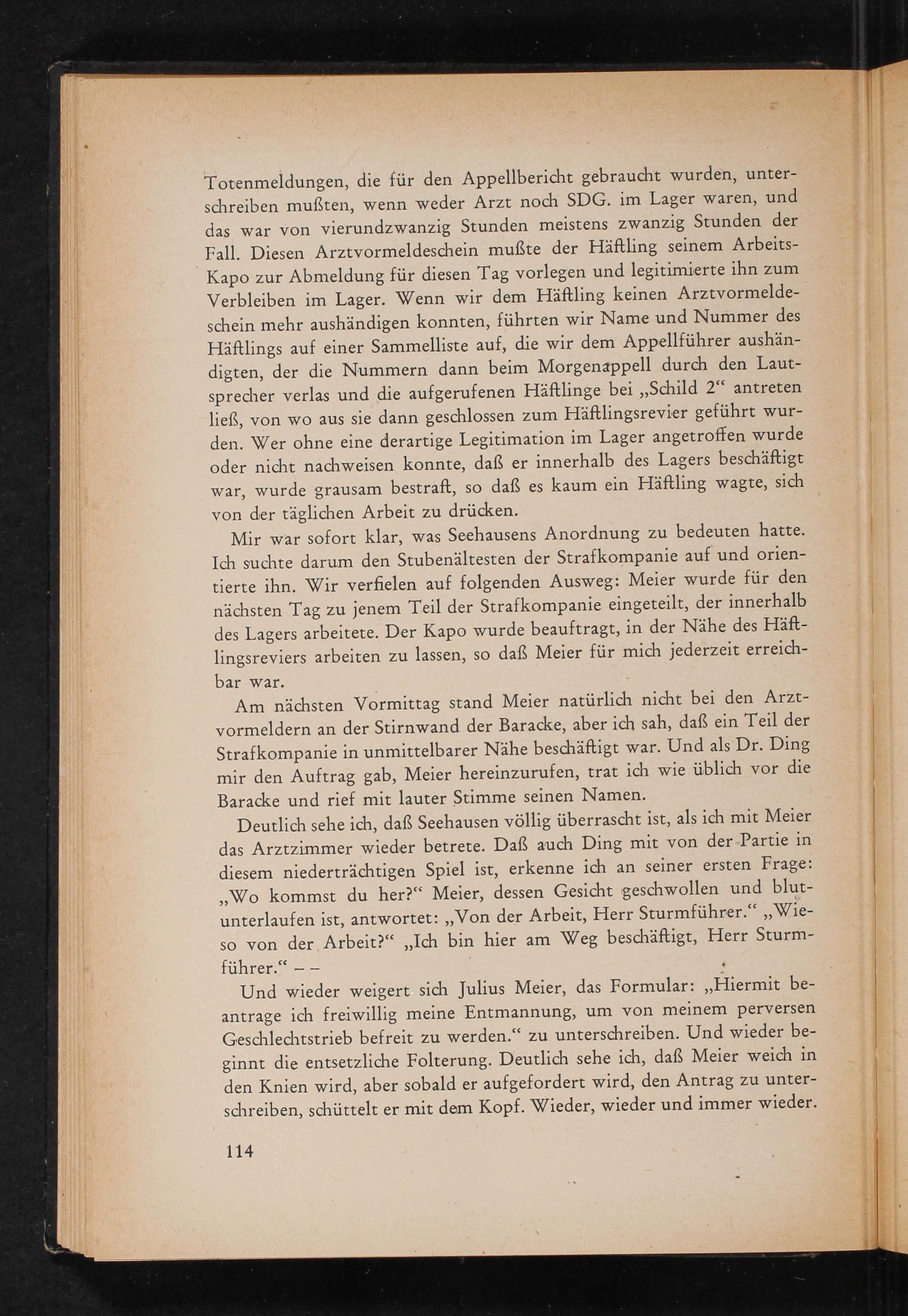 Mir war sofort klar, was Seehausens Anordnung zu bedeuten hatte. Ich suchte darum den Stubenältesten der Strafkompanie auf und orientierte ihn. Wir verfielen auf folgenden Ausweg: Meier wurde für den nächsten Tag zu jenem Teil der Strafkompanie eingeteilt, der innerhalb des Lagers arbeitete. Der Kapo wurde beauftragt, in der Nähe des Häftlingsreviers arbeiten zu lassen, so daß Meier für mich jederzeit erreichbar war.