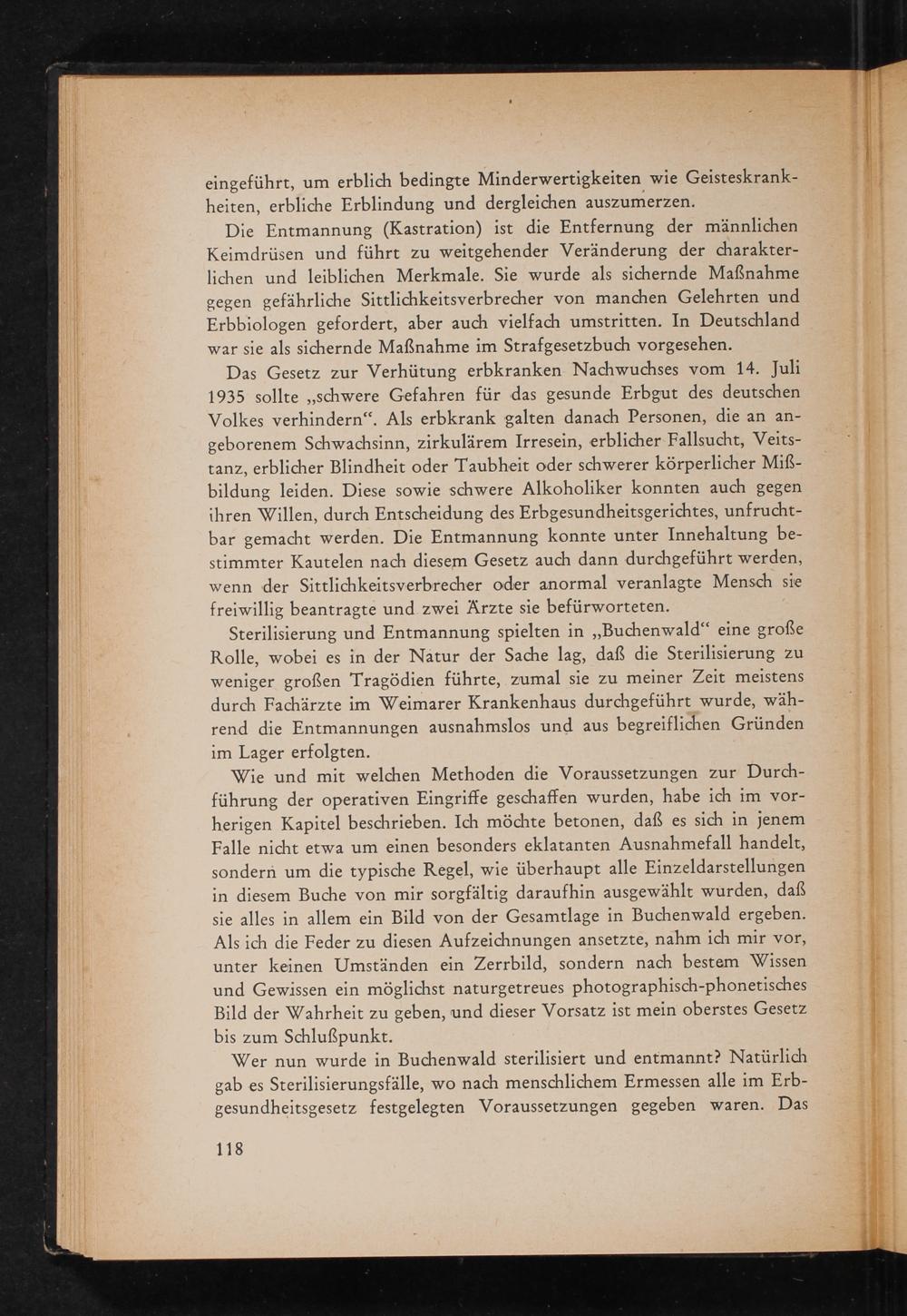Wie und mit welchen Methoden die Voraussetzungen zur Durchführung der operativen Eingriffe geschaffen wurden, habe ich im vorherigen Kapitel beschrieben. Ich möchte betonen, daß es sich in jenem Falle nicht etwa um einen besonders eklatanten Ausnahmefall handelt, sondern um die typische Regel, wie überhaupt alle Einzeldarstellungen in diesem Buche von mir sorgfältig daraufhin ausgewählt wurden, daß sie alles in allem ein Bild von der Gesamtlage in Buchenwald ergeben. Als ich die Feder zu diesen Aufzeichnungen ansetzte, nahm ich mir vor, unter keinen Umständen ein Zerrbild, sondern nach bestem Wissen und Gewissen ein möglichst naturgetreues photographisch- phonetisches Bild der Wahrheit zu geben, und dieser Vorsatz ist mein oberstes Gesetz bis zum Schlußpunkt.