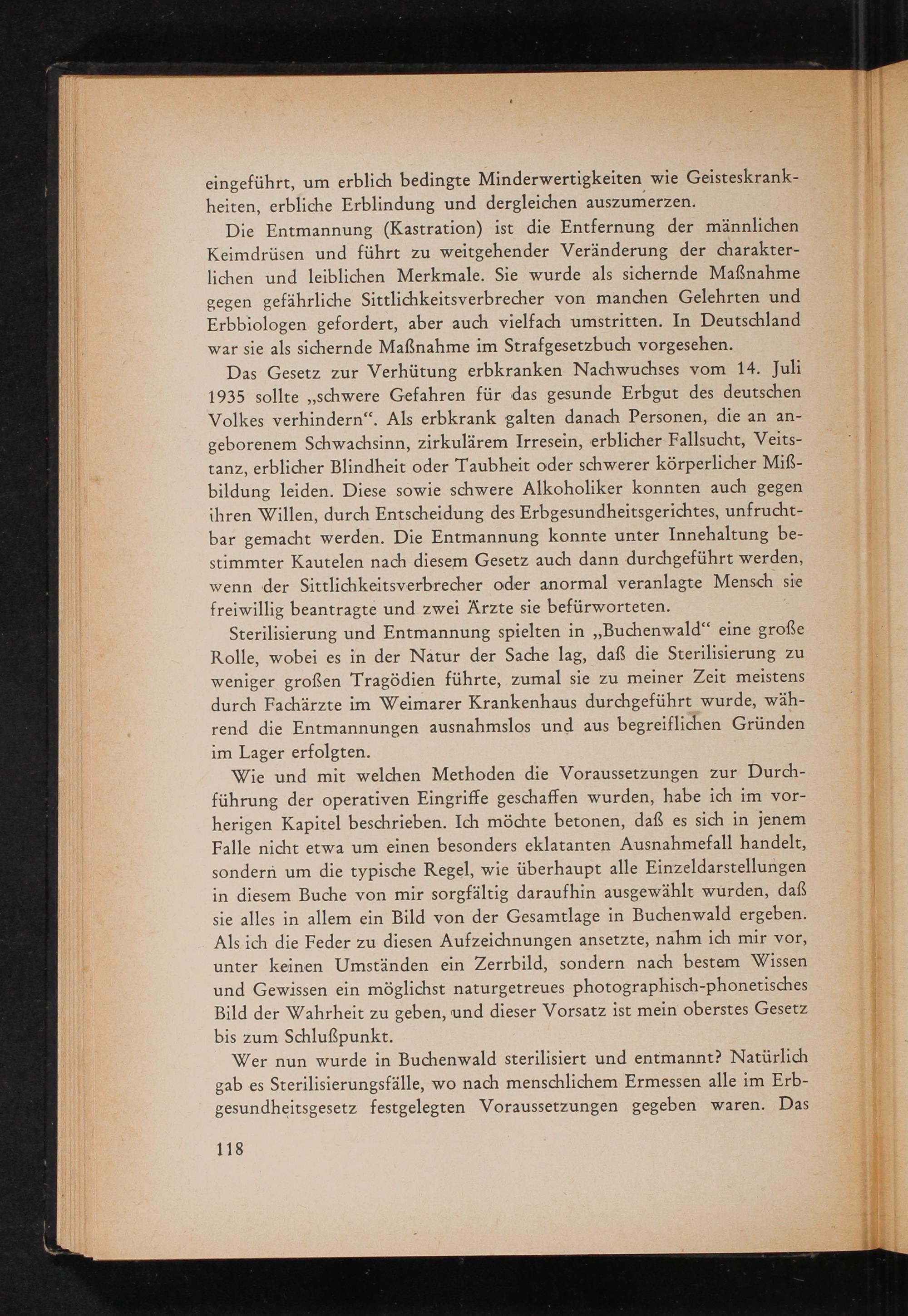 Sterilisierung und Entmannung spielten in ,, Buchenwald " eine große Rolle, wobei es in der Natur der Sache lag, daß die Sterilisierung zu weniger großen Tragödien führte, zumal sie zu meiner Zeit meistens durch Fachärzte im Weimarer Krankenhaus durchgeführt wurde, während die Entmannungen ausnahmslos und aus begreiflichen Gründen im Lager erfolgten.