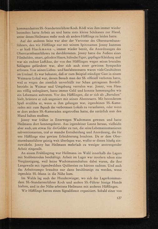 Auf der anderen Seite war aber der Vertreter des Obersturmbannführers, den wir Häftlinge nur mit seinem Spitznamen Jonny kannten - er hieß Hackmann-, immer wieder bereit, die Anordnungen des Obersturmbannführers zu durchkreuzen. Jonny hatte das Äußere eines Filmhelden, smart, gelockte Haare, hübsche Figur, gepflegte Kleidung und war ein rechter Luftikus, der von den Häftlingen wegen seines brutalen Schlagens gefürchtet war, aber sich auch einer gewissen Sympathie erfreute. Von seinen Liebes- und Saufabenteuern waren viele Geschichten im Umlauf. Es war bekannt, daß er zum Beispiel ständiger Gast in einem Weimarer Lokal war, dessen Besuch man der SS. offiziell verboten hatte, weil es wegen des ziemlich unverhüllt zur Schau getragenen Bordellbetriebs in Weimar und Umgebung verrufen war. Jonny, von Haus aus völlig unbegütert, hatte immer Geld und konnte hemmungslos wie ein Lebemann auftreten. Vor den Häftlingen, die er sich als ,, Burschen" hielt, brüstete er sich ungeniert mit seinen Abenteuern. Mit besonderem Spaß erzählte er, wenn es ihm gelungen war, irgendeinen SS. - Kameraden mit zum Besuch des verbotenen Lokals zu veranlassen, oder wenn er dort andere SS.- Kameraden angetroffen hatte, die natürlich nun den Mund halten mußten.