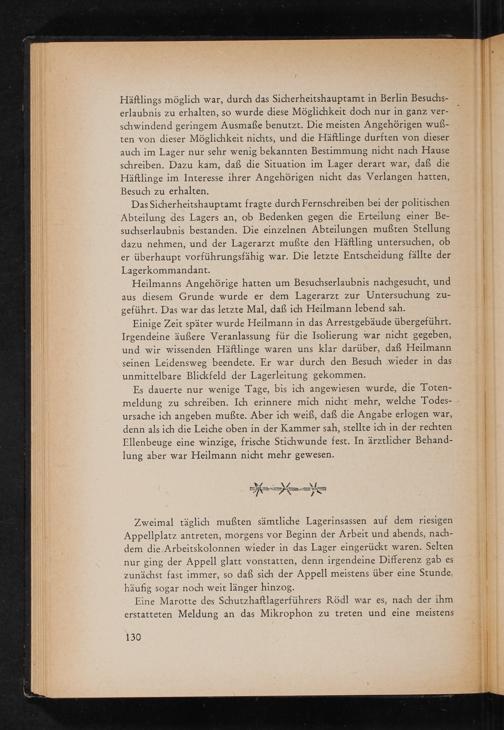 Heilmanns Angehörige hatten um Besuchserlaubnis nachgesucht, und aus diesem Grunde wurde er dem Lagerarzt zur Untersuchung zugeführt. Das war das letzte Mal, daß ich Heilmann lebend sah.