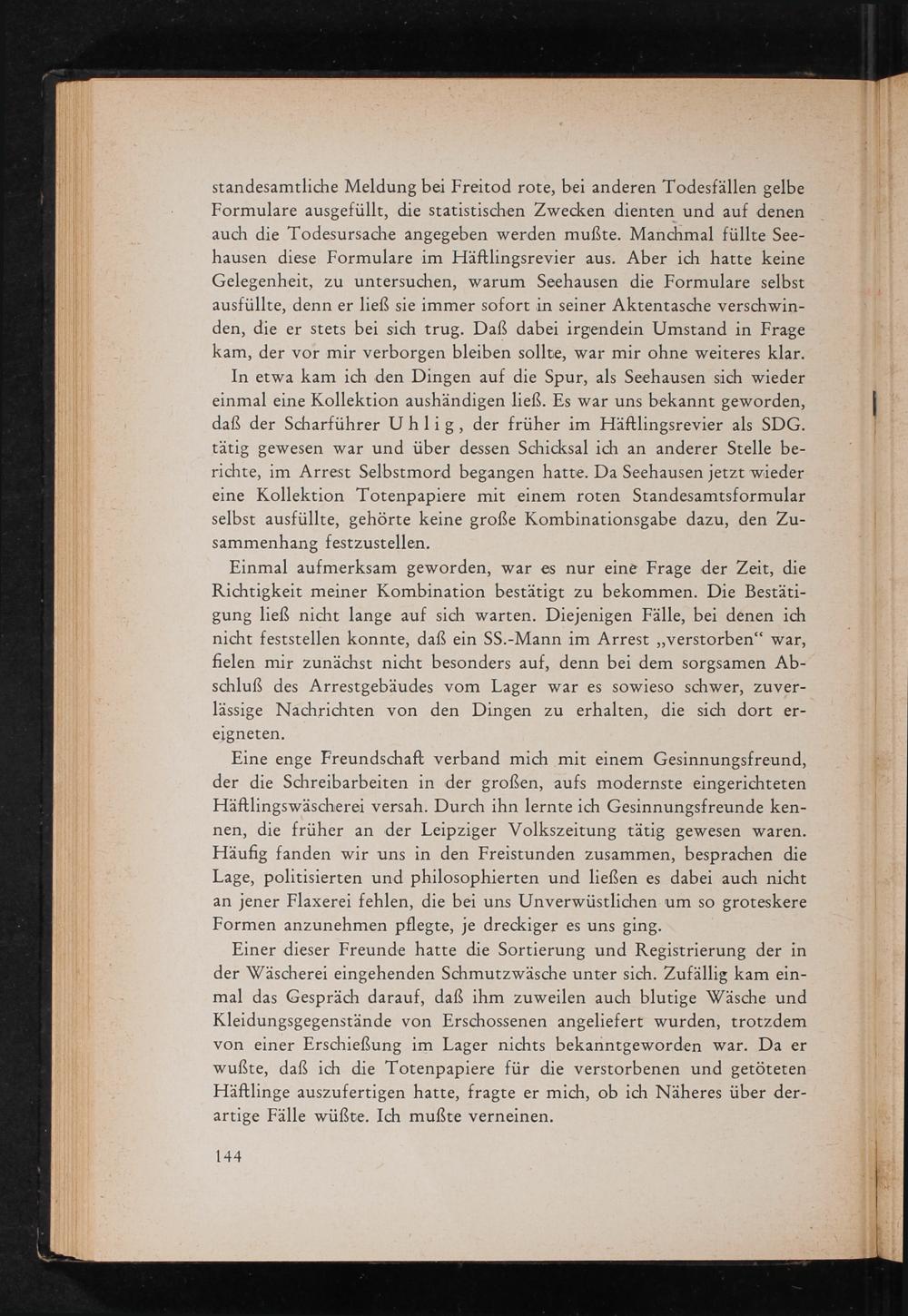 standesamtliche Meldung bei Freitod rote, bei anderen Todesfällen gelbe Formulare ausgefüllt, die statistischen Zwecken dienten und auf denen auch die Todesursache angegeben werden mußte. Manchmal füllte Seehausen diese Formulare im Häftlingsrevier aus. Aber ich hatte keine Gelegenheit, zu untersuchen, warum Seehausen die Formulare selbst ausfüllte, denn er ließ sie immer sofort in seiner Aktentasche verschwinden, die er stets bei sich trug. Daß dabei irgendein Umstand in Frage kam, der vor mir verborgen bleiben sollte, war mir ohne weiteres klar. In etwa kam ich den Dingen auf die Spur, als Seehausen sich wieder einmal eine Kollektion aushändigen ließ. Es war uns bekannt geworden, daß der Scharführer Uhlig, der früher im Häftlingsrevier als SDG. tätig gewesen war und über dessen Schicksal ich an anderer Stelle berichte, im Arrest Selbstmord begangen hatte. Da Seehausen jetzt wieder eine Kollektion Totenpapiere mit einem roten Standesamtsformular selbst ausfüllte, gehörte keine große Kombinationsgabe dazu, den Zusammenhang festzustellen.