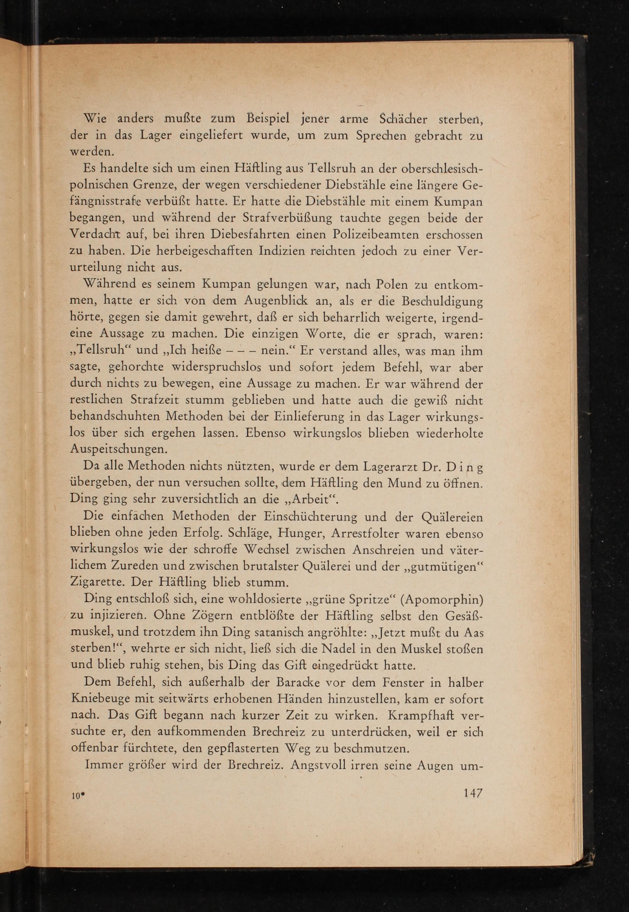 Ding entschloß sich, eine wohldosierte ,, grüne Spritze"( Apomorphin) zu injizieren. Ohne Zögern entblößte der Häftling selbst den Gesäßmuskel, und trotzdem ihn Ding satanisch angröhlte: ,, Jetzt mußt du Aas sterben!", wehrte er sich nicht, ließ sich die Nadel in den Muskel stoßen und blieb ruhig stehen, bis Ding das Gift eingedrückt hatte.