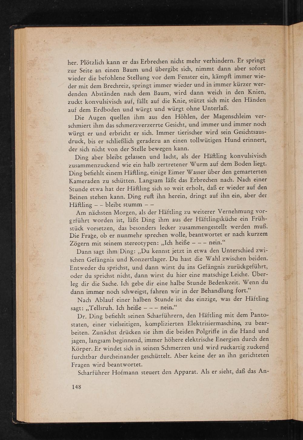 Dann sagt ihm Ding: ,, Du kennst jetzt in etwa den Unterschied zwischen Gefängnis und Konzertlager. Du hast die Wahl zwischen beiden. Entweder du sprichst, und dann wirst du ins Gefängnis zurückgeführt, oder du sprichst nicht, dann wirst du hier eine matschige Leiche. Überleg dir die Sache. Ich gebe dir eine halbe Stunde Bedenkzeit. Wenn du dann immer noch schweigst, fahren wir in der Behandlung fort."