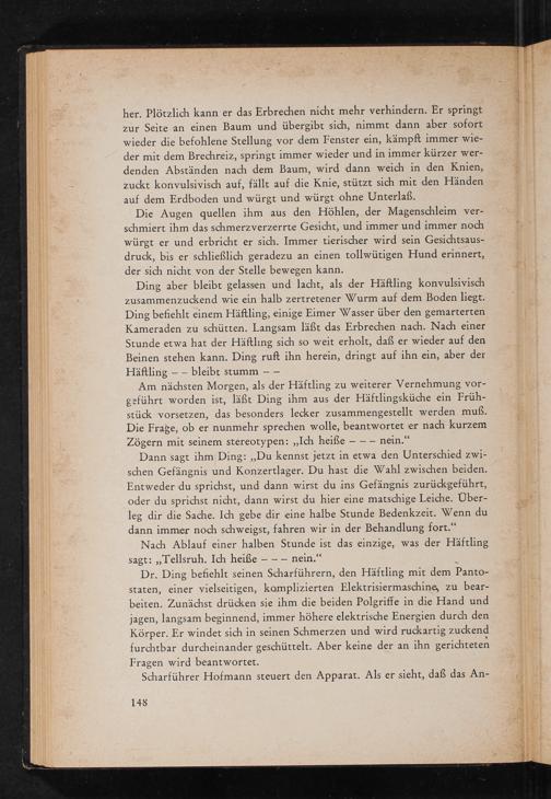Ding aber bleibt gelassen und lacht, als der Häftling konvulsivisch zusammenzuckend wie ein halb zertretener Wurm auf dem Boden liegt. Ding befiehlt einem Häftling, einige Eimer Wasser über den gemarterten Kameraden zu schütten. Langsam läßt das Erbrechen nach. Nach einer Stunde etwa hat der Häftling sich so weit erholt, daß er wieder auf den Beinen stehen kann. Ding ruft ihn herein, dringt auf ihn ein, aber der Häftling bleibt stumm