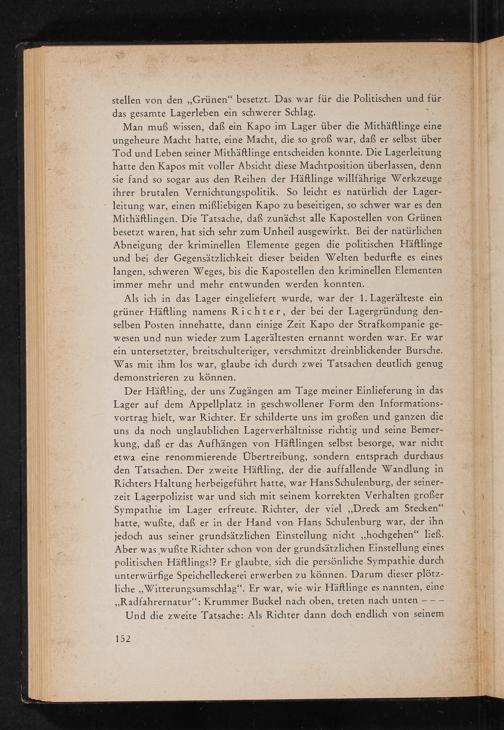Als ich in das Lager eingeliefert wurde, war der 1. Lagerälteste ein grüner Häftling namens Richter, der bei der Lagergründung denselben Posten innehatte, dann einige Zeit Kapo der Strafkompanie gewesen und nun wieder zum Lagerältesten ernannt worden war. Er war ein untersetzter, breitschulteriger, verschmitzt dreinblickender Bursche. Was mit ihm los war, glaube ich durch zwei Tatsachen deutlich genug demonstrieren zu können.