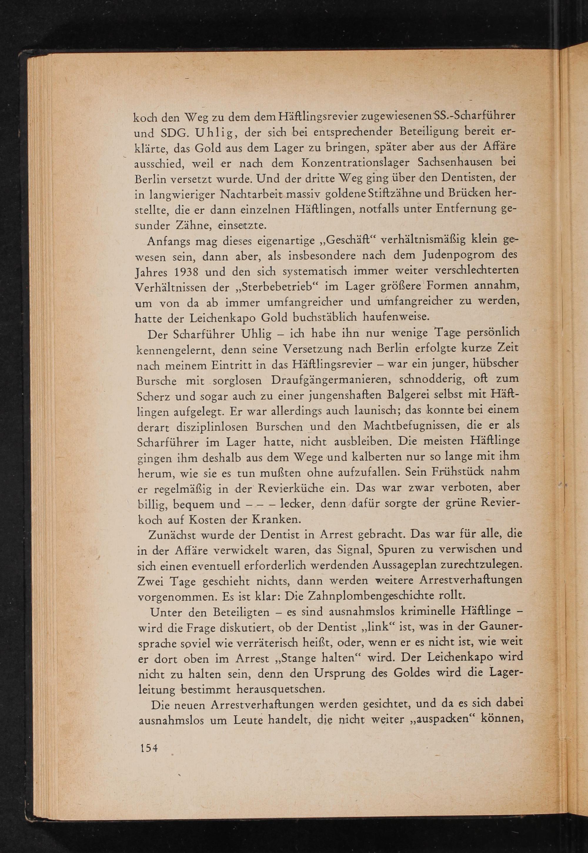 koch den Weg zu dem dem Häftlingsrevier zugewiesenen SS.- Scharführer und SDG. Uhlig, der sich bei entsprechender Beteiligung bereit erklärte, das Gold aus dem Lager zu bringen, später aber aus der Affäre ausschied, weil er nach dem Konzentrationslager Sachsenhausen bei Berlin versetzt wurde. Und der dritte Weg ging über den Dentisten, der in langwieriger Nachtarbeit massiv goldene Stiftzähne und Brücken herstellte, die er dann einzelnen Häftlingen, notfalls unter Entfernung gesunder Zähne, einsetzte.