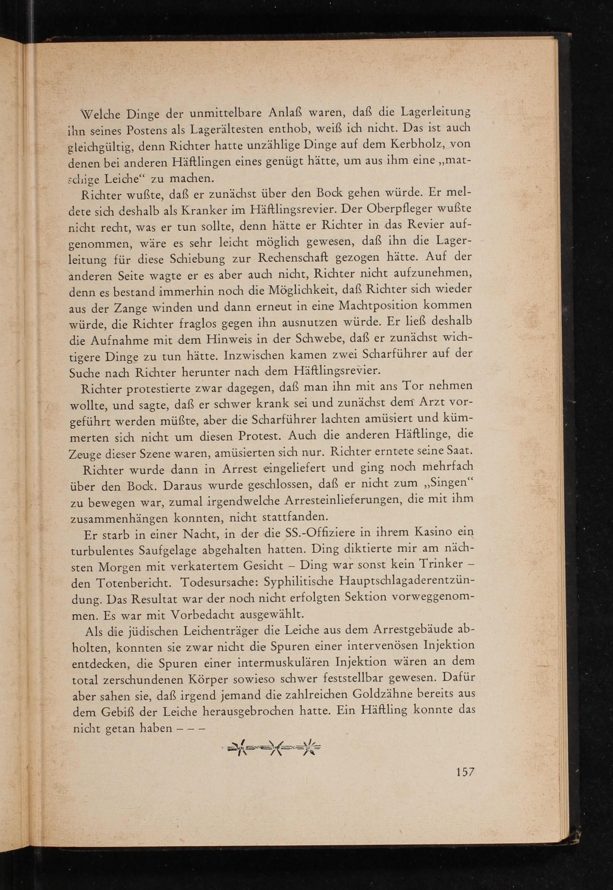 Welche Dinge der unmittelbare Anlaß waren, daß die Lagerleitung ihn seines Postens als Lagerältesten enthob, weiß ich nicht. Das ist auch gleichgültig, denn Richter hatte unzählige Dinge auf dem Kerbholz, von denen bei anderen Häftlingen eines genügt hätte, um aus ihm eine ,, matschige Leiche" zu machen.