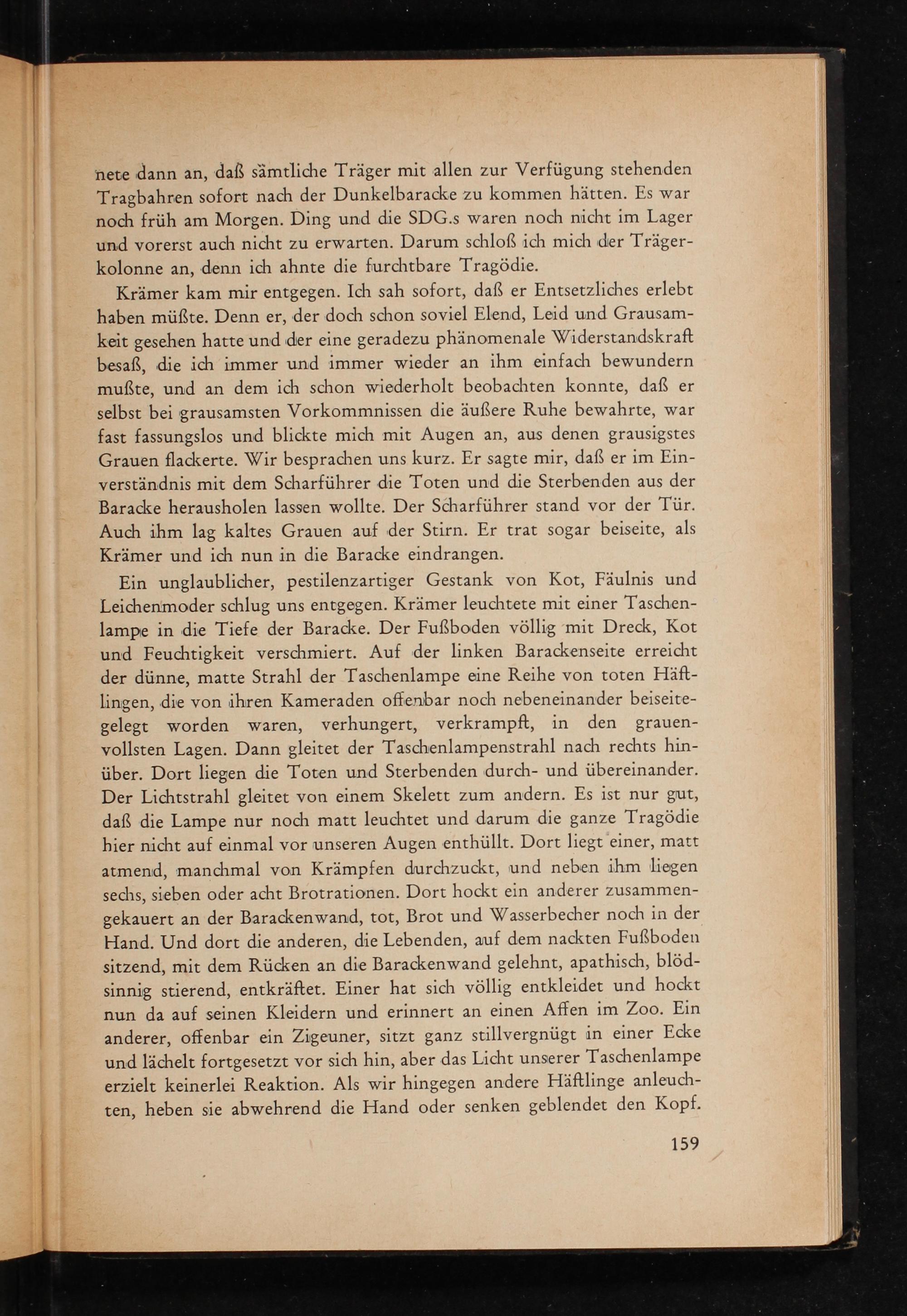 Ein unglaublicher, pestilenzartiger Gestank von Kot, Fäulnis und Leichenmoder schlug uns entgegen. Krämer leuchtete mit einer Taschenlampe in die Tiefe der Baracke. Der Fußboden völlig mit Dreck, Kot und Feuchtigkeit verschmiert. Auf der linken Barackenseite erreicht der dünne, matte Strahl der Taschenlampe eine Reihe von toten Häftlingen, die von ihren Kameraden offenbar noch nebeneinander beiseitegelegt worden waren, verhungert, verkrampft, in den grauenvollsten Lagen. Dann gleitet der Taschenlampenstrahl nach rechts hinüber. Dort liegen die Toten und Sterbenden durch- und übereinander. Der Lichtstrahl gleitet von einem Skelett zum andern. Es ist nur gut, daß die Lampe nur noch matt leuchtet und darum die ganze Tragödie hier nicht auf einmal vor unseren Augen enthüllt. Dort liegt einer, matt atmend, manchmal von Krämpfen durchzuckt, und neben ihm liegen sechs, sieben oder acht Brotrationen. Dort hockt ein anderer zusammengekauert an der Barackenwand, tot, Brot und Wasserbecher noch in der Hand. Und dort die anderen, die Lebenden, auf dem nackten Fußboden sitzend, mit dem Rücken an die Barackenwand gelehnt, apathisch, blödsinnig stierend, entkräftet. Einer hat sich völlig entkleidet und hockt nun da auf seinen Kleidern und erinnert an einen Affen im Zoo. Ein anderer, offenbar ein Zigeuner, sitzt ganz stillvergnügt in einer Ecke und lächelt fortgesetzt vor sich hin, aber das Licht unserer Taschenlampe erzielt keinerlei Reaktion. Als wir hingegen andere Häftlinge anleuchten, heben sie abwehrend die Hand oder senken geblendet den Kopf.