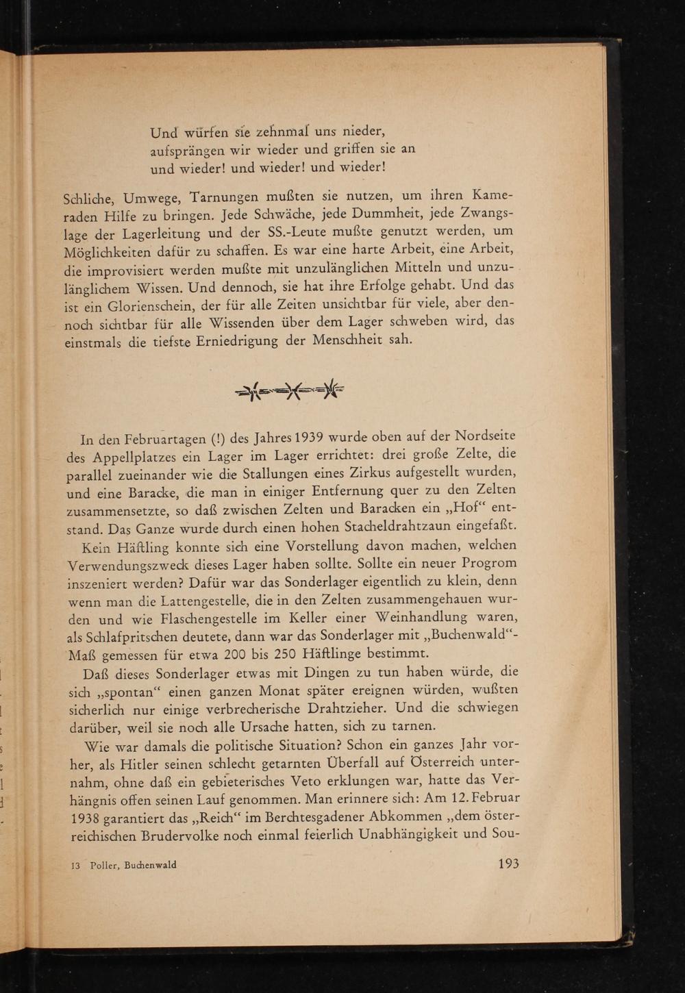 Kein Häftling konnte sich eine Vorstellung davon machen, welchen Verwendungszweck dieses Lager haben sollte. Sollte ein neuer Progrom inszeniert werden? Dafür war das Sonderlager eigentlich zu klein, denn wenn man die Lattengestelle, die in den Zelten zusammengehauen wurden und wie Flaschengestelle im Keller einer Weinhandlung waren, als Schlafpritschen deutete, dann war das Sonderlager mit ,, Buchenwald "- Maß gemessen für etwa 200 bis 250 Häftlinge bestimmt.
