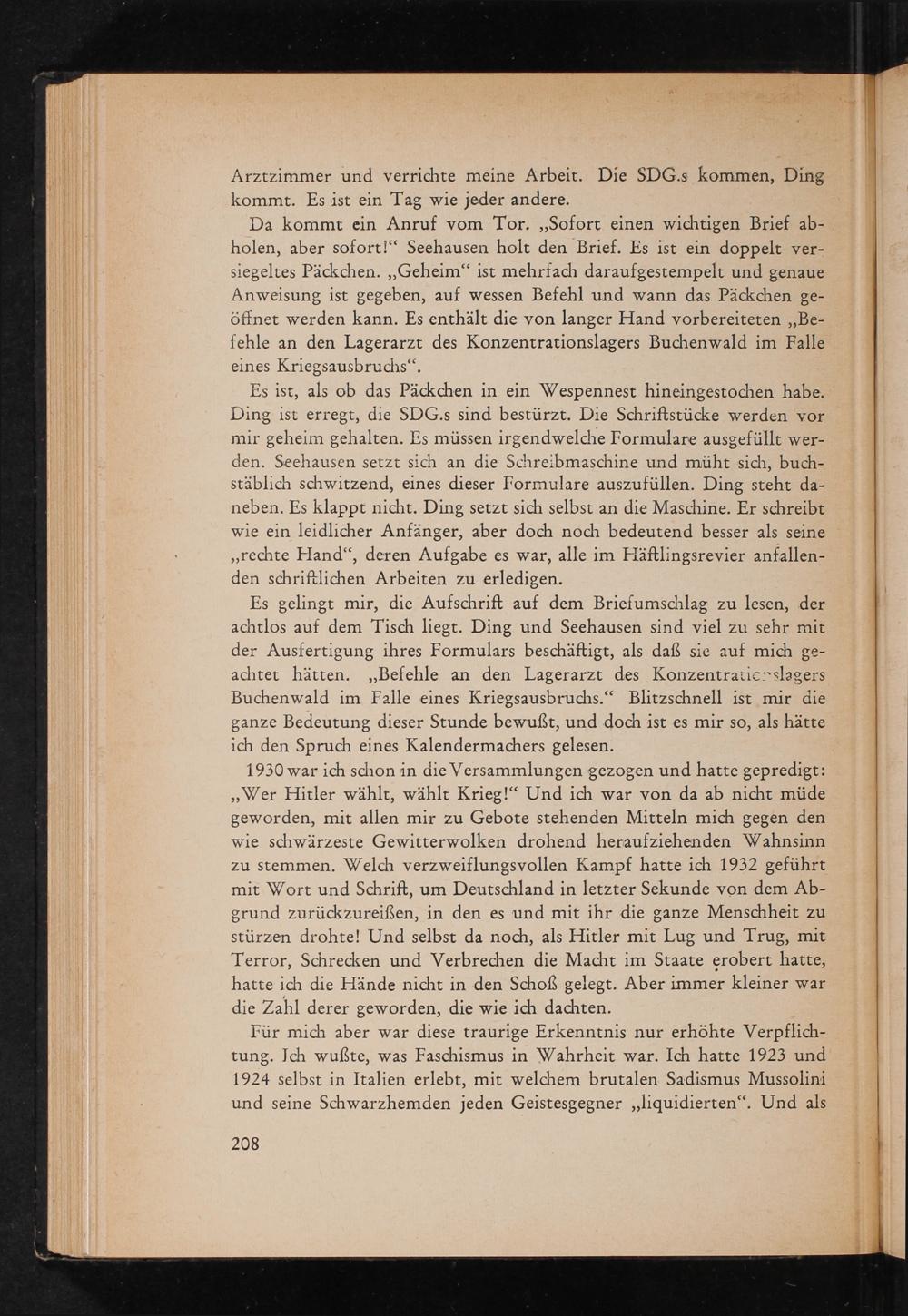 Es gelingt mir, die Aufschrift auf dem Briefumschlag zu lesen, der achtlos auf dem Tisch liegt. Ding und Seehausen sind viel zu sehr mit der Ausfertigung ihres Formulars beschäftigt, als daß sie auf mich geachtet hätten. ,, Befehle an den Lagerarzt des Konzentrationslagers Buchenwald im Falle eines Kriegsausbruchs." Blitzschnell ist mir die ganze Bedeutung dieser Stunde bewußt, und doch ist es mir so, als hätte ich den Spruch eines Kalendermachers gelesen.