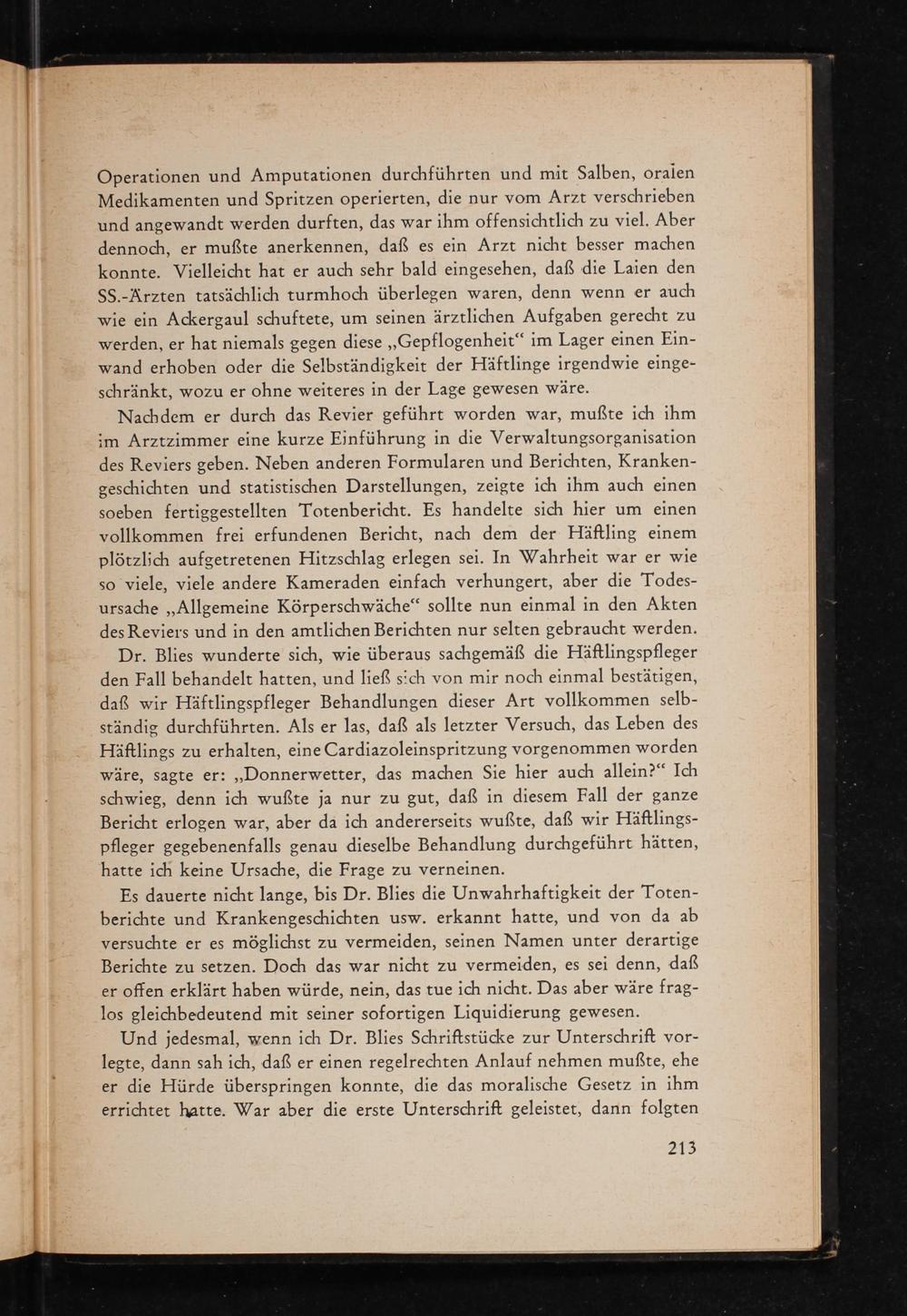 Dr. Blies wunderte sich, wie überaus sachgemäß die Häftlingspfleger den Fall behandelt hatten, und ließ sich von mir noch einmal bestätigen, daß wir Häftlingspfleger Behandlungen dieser Art vollkommen selb- ständig durchführten. Als er las, daß als letzter Versuch, das Leben des Häftlings zu erhalten, eine Cardiazoleinspritzung vorgenommen worden wäre, sagte er:„Donnerwetter, das machen Sie hier auch allein?“ Ich schwieg, denn ich wußte ja nur zu gut, daß in diesem Fall der ganze Bericht erlogen war, aber da ich andererseits wußte, daß wir Häftlings- pfleger gegebenenfalls genau dieselbe Behandlung durchgeführt hätten, hatte ich keine Ursache, die Frage zu verneinen.