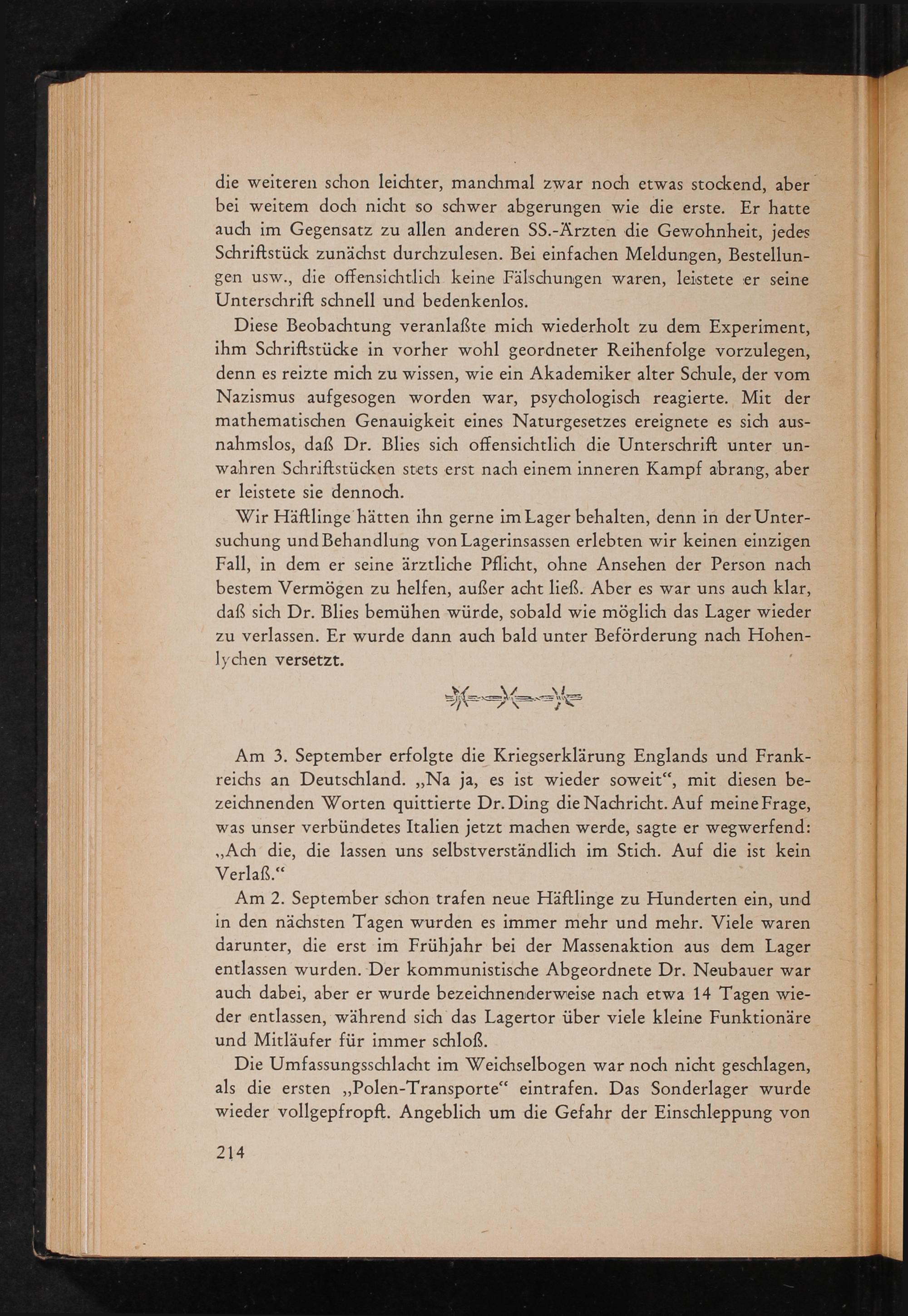 die weiteren schon leichter, manchmal zwar noch etwas stockend, aber bei weitem doch nicht so schwer abgerungen wie die erste. Er hatte auch im Gegensatz zu allen anderen SS.- Ärzten die Gewohnheit, jedes Schriftstück zunächst durchzulesen. Bei einfachen Meldungen, Bestellungen usw., die offensichtlich keine Fälschungen waren, leistete er seine Unterschrift schnell und bedenkenlos.