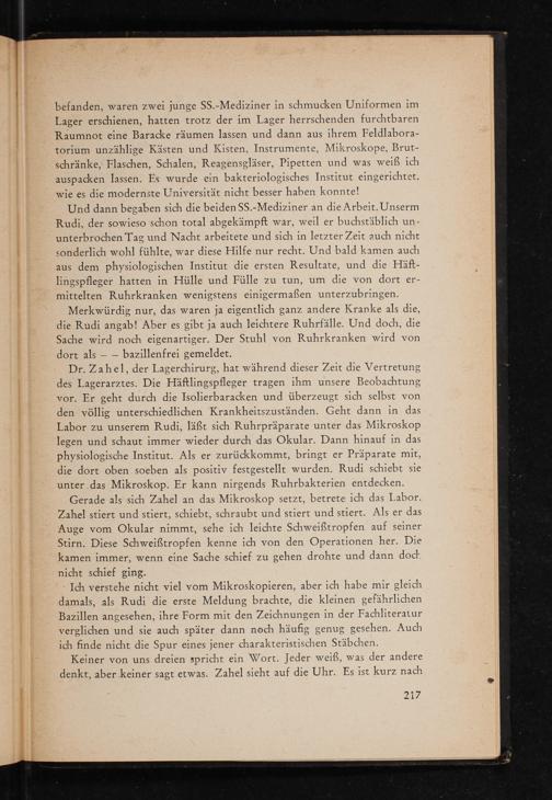 Und dann begaben sich die beiden SS.- Mediziner an die Arbeit. Unserm Rudi, der sowieso schon total abgekämpft war, weil er buchstäblich ununterbrochen Tag und Nacht arbeitete und sich in letzter Zeit auch nicht. sonderlich wohl fühlte, war diese Hilfe nur recht. Und bald kamen auch aus dem physiologischen Institut die ersten Resultate, und die Häftlingspfleger hatten in Hülle und Fülle zu tun, um die von dort ermittelten Ruhrkranken wenigstens einigermaßen unterzubringen.