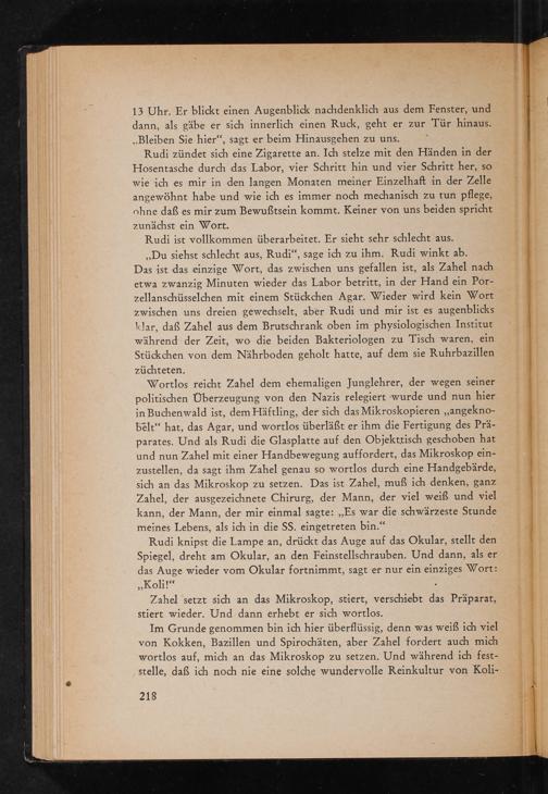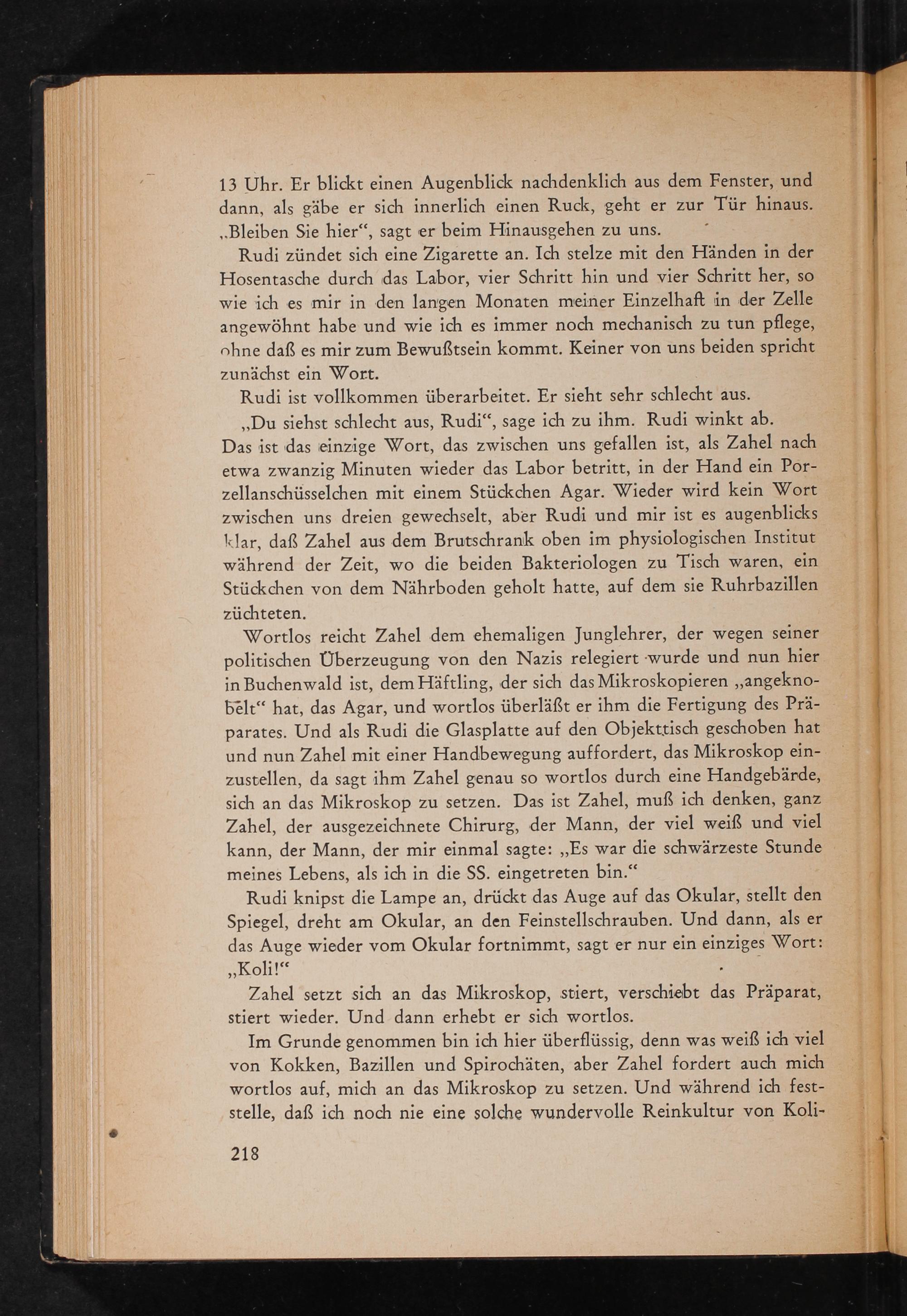 Wortlos reicht Zahel dem ehemaligen Junglehrer, der wegen seiner politischen Überzeugung von den Nazis relegiert wurde und nun hier in Buchenwald ist, dem Häftling, der sich das Mikroskopieren ,, angeknobelt" hat, das Agar, und wortlos überläßt er ihm die Fertigung des Präparates. Und als Rudi die Glasplatte auf den Objekttisch geschoben hat und nun Zahel mit einer Handbewegung auffordert, das Mikroskop einzustellen, da sagt ihm Zahel genau so wortlos durch eine Handgebärde, sich an das Mikroskop zu setzen. Das ist Zahel, muß ich denken, ganz Zahel, der ausgezeichnete Chirurg, der Mann, der viel weiß und viel kann, der Mann, der mir einmal sagte: ,, Es war die schwärzeste Stunde meines Lebens, als ich in die SS. eingetreten bin."