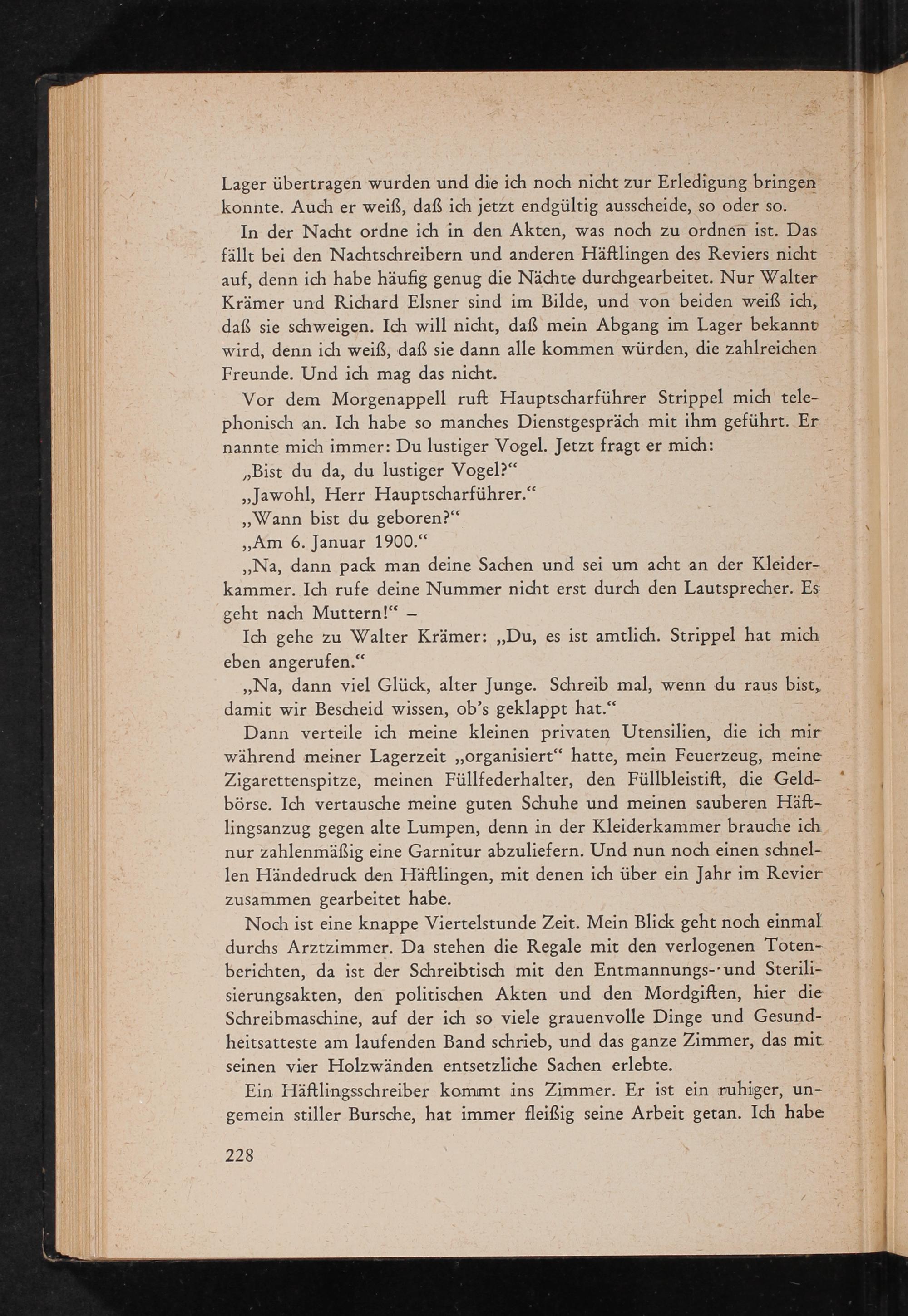 In der Nacht ordne ich in den Akten, was noch zu ordnen ist. Das fällt bei den Nachtschreibern und anderen Häftlingen des Reviers nicht auf, denn ich habe häufig genug die Nächte durchgearbeitet. Nur Walter Krämer und Richard Elsner sind im Bilde, und von beiden weiß ich, daß sie schweigen. Ich will nicht, daß mein Abgang im Lager bekannt wird, denn ich weiß, daß sie dann alle kommen würden, die zahlreichen Freunde. Und ich mag das nicht.