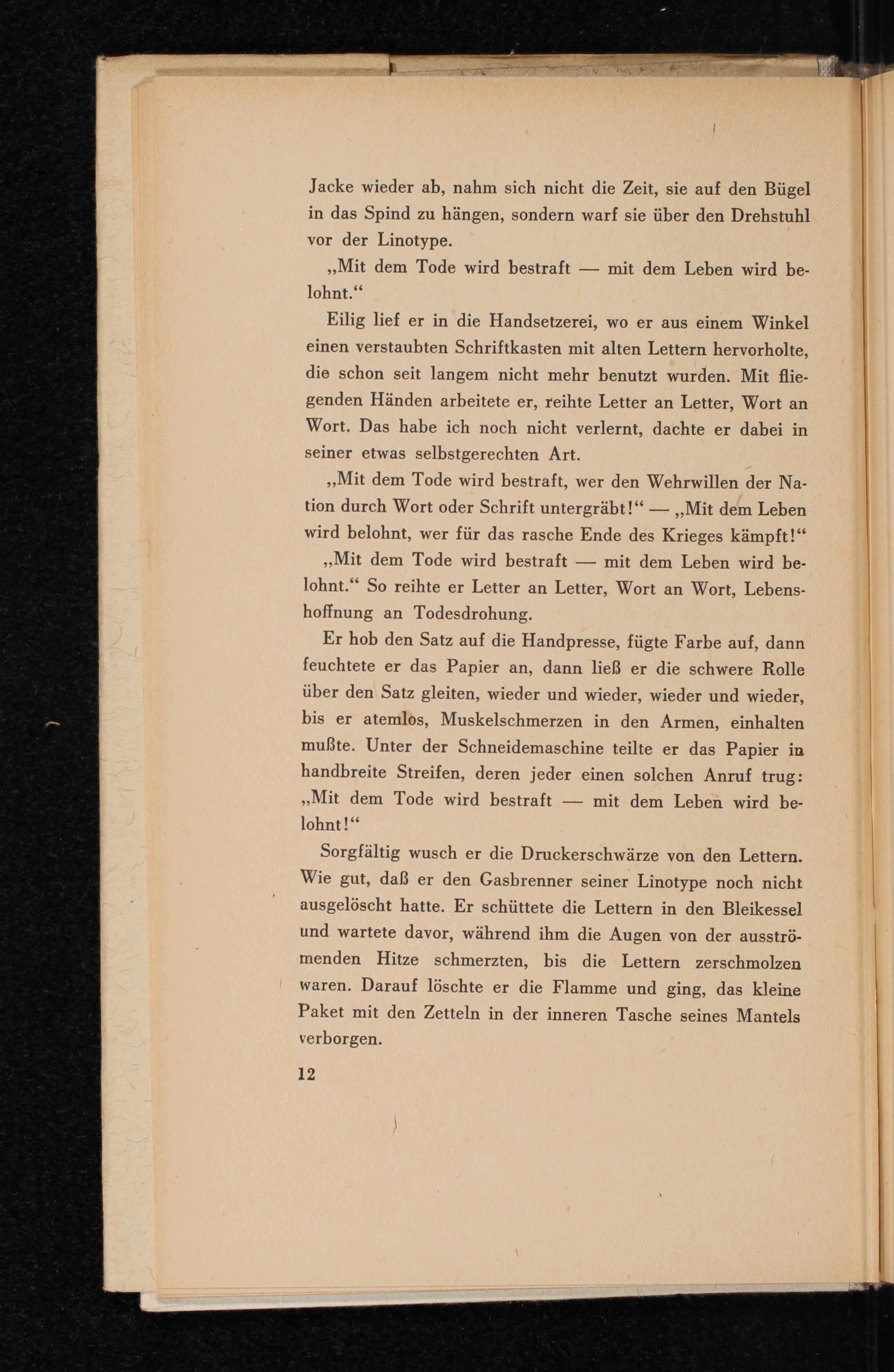,, Mit dem Tode wird bestraft, wer den Wehrwillen der Nation durch Wort oder Schrift untergräbt!"- ,, Mit dem Leben wird belohnt, wer für das rasche Ende des Krieges kämpft!" ,, Mit dem Tode wird bestraft mit dem Leben wird belohnt." So reihte er Letter an Letter, Wort an Wort, Lebenshoffnung an Todesdrohung.