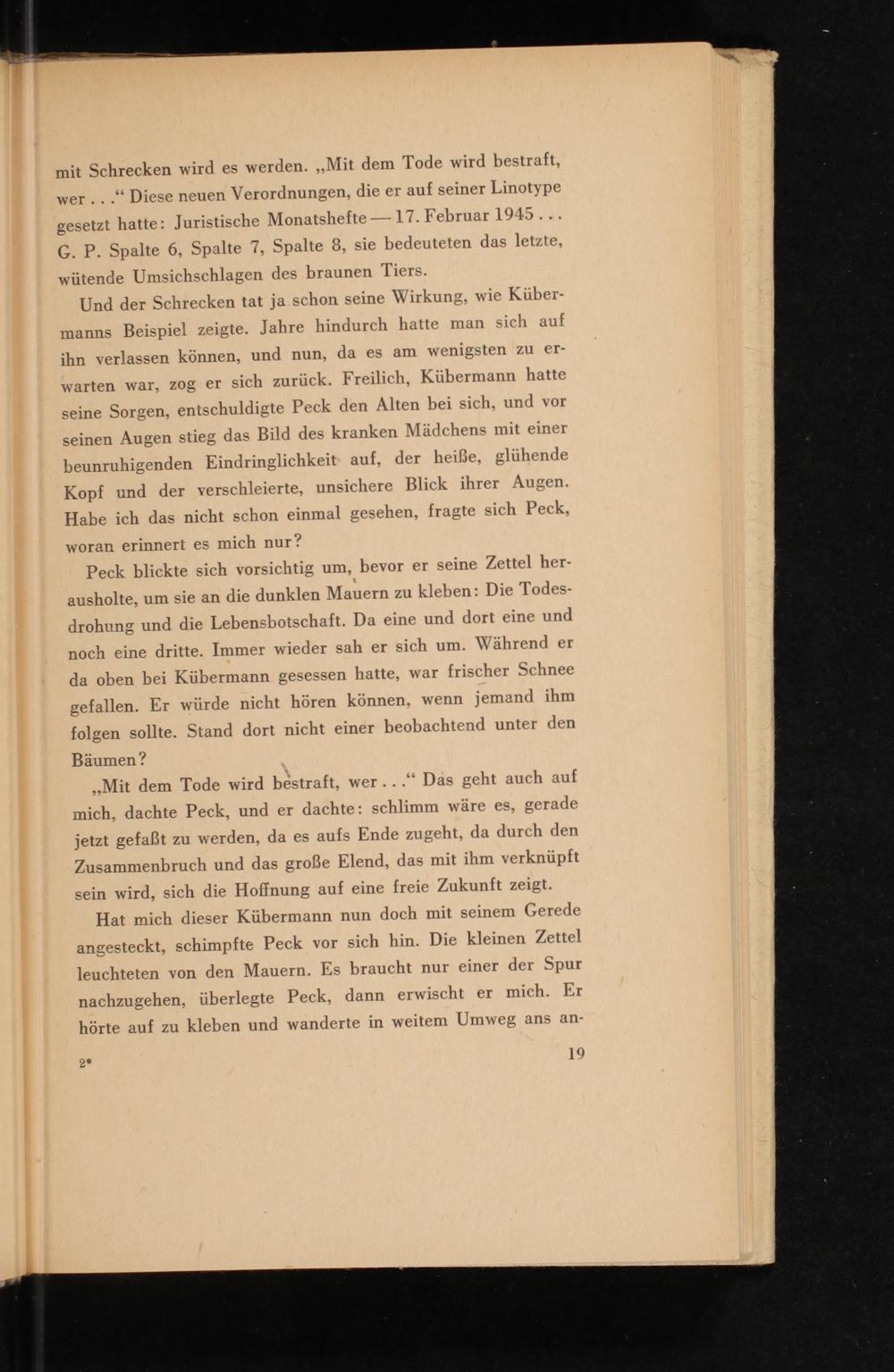 mit Schrecken wird es werden. ,, Mit dem Tode wird bestraft, wer..." Diese neuen Verordnungen, die er auf seiner Linotype gesetzt hatte: Juristische Monatshefte- 17. Februar 1945... G. P. Spalte 6, Spalte 7, Spalte 8, sie bedeuteten das letzte, wütende Umsichschlagen des braunen Tiers.