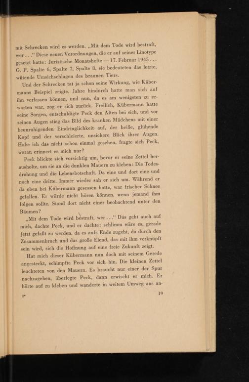 ,, Mit dem Tode wird bestraft, wer..." Das geht auch auf mich, dachte Peck, und er dachte: schlimm wäre es, gerade jetzt gefaßt zu werden, da es aufs Ende zugeht, da durch den Zusammenbruch und das große Elend, das mit ihm verknüpft sein wird, sich die Hoffnung auf eine freie Zukunft zeigt.