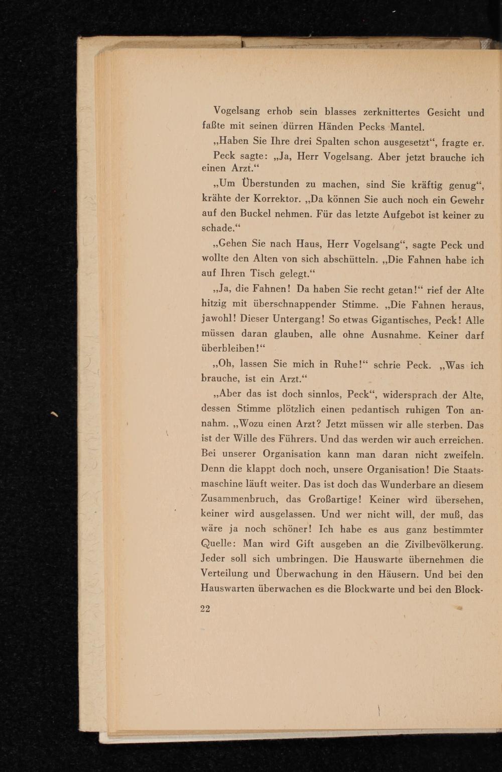 ,, Aber das ist doch sinnlos, Peck", widersprach der Alte, dessen Stimme plötzlich einen pedantisch ruhigen Ton annahm. ,, Wozu einen Arzt? Jetzt müssen wir alle sterben. Das ist der Wille des Führers. Und das werden wir auch erreichen. Bei unserer Organisation kann man daran nicht zweifeln. Denn die klappt doch noch, unsere Organisation! Die Staatsmaschine läuft weiter. Das ist doch das Wunderbare an diesem Zusammenbruch, das Großartige! Keiner wird übersehen, keiner wird ausgelassen. Und wer nicht will, der muß, das wäre ja noch schöner! Ich habe es aus ganz bestimmter Quelle: Man wird Gift ausgeben an die Zivilbevölkerung. Jeder soll sich umbringen. Die Hauswarte übernehmen die Verteilung und Überwachung in den Häusern. Und bei den Hauswarten überwachen es die Blockwarte und bei den Block