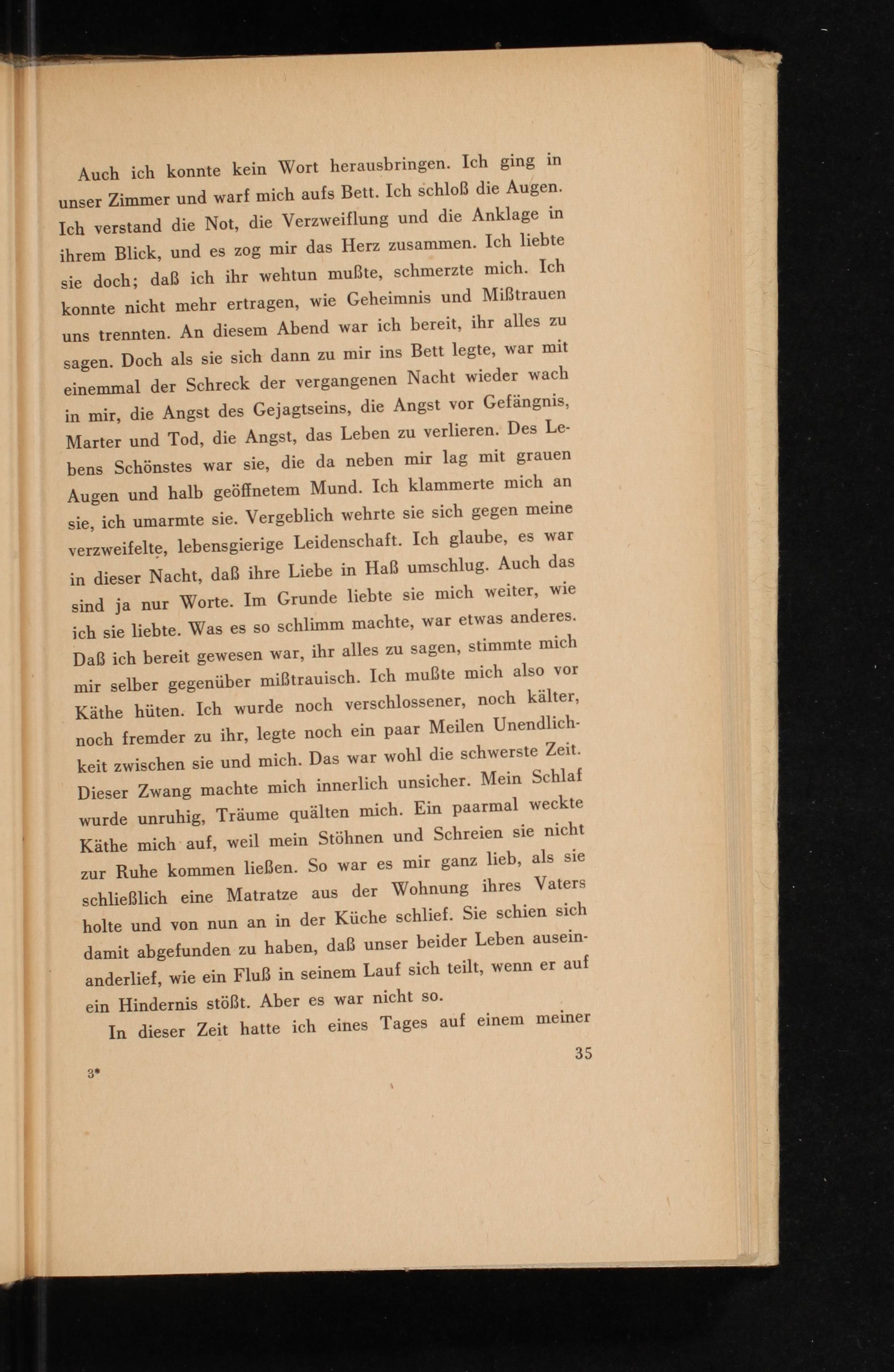 Auch ich konnte kein Wort herausbringen. Ich ging in unser Zimmer und warf mich aufs Bett. Ich schloß die Augen. Ich verstand die Not, die Verzweiflung und die Anklage in ihrem Blick, und es zog mir das Herz zusammen. Ich liebte sie doch; daß ich ihr wehtun mußte, schmerzte mich. Ich konnte nicht mehr ertragen, wie Geheimnis und Mißtrauen uns trennten. An diesem Abend war ich bereit, ihr alles zu sagen. Doch als sie sich dann zu mir ins Bett legte, war mit einemmal der Schreck der vergangenen Nacht wieder wach in mir, die Angst des Gejagtseins, die Angst vor Gefängnis, Marter und Tod, die Angst, das Leben zu verlieren. Des Lebens Schönstes war sie, die da neben mir lag mit grauen Augen und halb geöffnetem Mund. Ich klammerte mich an sie, ich umarmte sie. Vergeblich wehrte sie sich gegen meine verzweifelte, lebensgierige Leidenschaft. Ich glaube, es war in dieser Nacht, daß ihre Liebe in Haß umschlug. Auch das sind ja nur Worte. Im Grunde liebte sie mich weiter, wie ich sie liebte. Was es so schlimm machte, war etwas anderes. Daß ich bereit gewesen war, ihr alles zu sagen, stimmte mich mir selber gegenüber mißtrauisch. Ich mußte mich also vor Käthe hüten. Ich wurde noch verschlossener, noch kälter, noch fremder zu ihr, legte noch ein paar Meilen Unendlichkeit zwischen sie und mich. Das war wohl die schwerste Zeit. Dieser Zwang machte mich innerlich unsicher. Mein Schlaf wurde unruhig, Träume quälten mich. Ein paarmal weckte Käthe mich auf, weil mein Stöhnen und Schreien sie nicht zur Ruhe kommen ließen. So war es mir ganz lieb, als sie schließlich eine Matratze aus der Wohnung ihres Vaters holte und von nun an in der Küche schlief. Sie schien sich damit abgefunden zu haben, daß unser beider Leben auseinanderlief, wie ein Fluß in seinem Lauf sich teilt, wenn er auf ein Hindernis stößt. Aber es war nicht so.