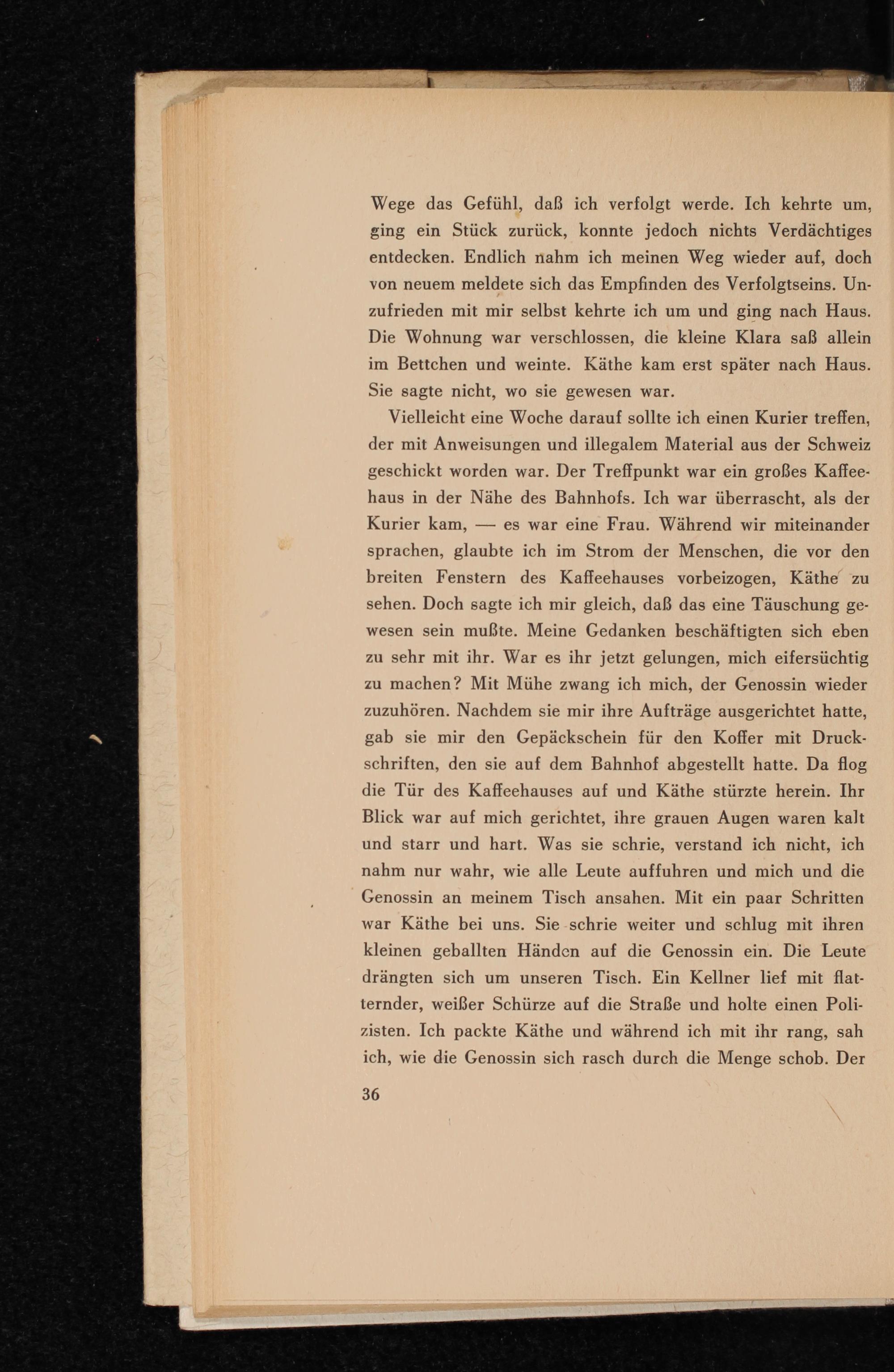 Wege das Gefühl, daß ich verfolgt werde. Ich kehrte um, ging ein Stück zurück, konnte jedoch nichts Verdächtiges entdecken. Endlich nahm ich meinen Weg wieder auf, doch von neuem meldete sich das Empfinden des Verfolgtseins. Unzufrieden mit mir selbst kehrte ich um und ging nach Haus. Die Wohnung war verschlossen, die kleine Klara saẞ allein im Bettchen und weinte. Käthe kam erst später nach Haus. Sie sagte nicht, wo sie gewesen war.