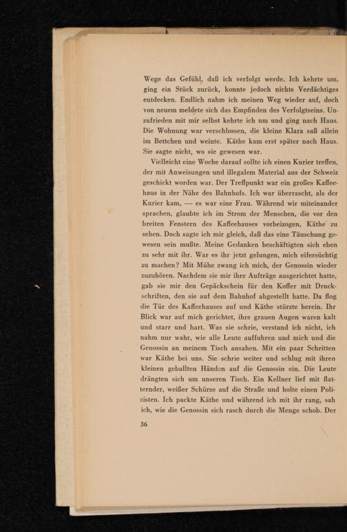 Vielleicht eine Woche darauf sollte ich einen Kurier treffen, der mit Anweisungen und illegalem Material aus der Schweiz geschickt worden war. Der Treffpunkt war ein großes Kaffeehaus in der Nähe des Bahnhofs. Ich war überrascht, als der Kurier kam, es war eine Frau. Während wir miteinander sprachen, glaubte ich im Strom der Menschen, die vor den breiten Fenstern des Kaffeehauses vorbeizogen, Käthe zu sehen. Doch sagte ich mir gleich, daß das eine Täuschung gewesen sein mußte. Meine Gedanken beschäftigten sich eben zu sehr mit ihr. War es ihr jetzt gelungen, mich eifersüchtig zu machen? Mit Mühe zwang ich mich, der Genossin wieder zuzuhören. Nachdem sie mir ihre Aufträge ausgerichtet hatte, gab sie mir den Gepäckschein für den Koffer mit Druckschriften, den sie auf dem Bahnhof abgestellt hatte. Da flog die Tür des Kaffeehauses auf und Käthe stürzte herein. Ihr Blick war auf mich gerichtet, ihre grauen Augen waren kalt und starr und hart. Was sie schrie, verstand ich nicht, ich nahm nur wahr, wie alle Leute auffuhren und mich und die Genossin an meinem Tisch ansahen. Mit ein paar Schritten war Käthe bei uns. Sie schrie weiter und schlug mit ihren kleinen geballten Händen auf die Genossin ein. Die Leute drängten sich um unseren Tisch. Ein Kellner lief mit flatternder, weißer Schürze auf die Straße und holte einen Polizisten. Ich packte Käthe und während ich mit ihr rang, sah ich, wie die Genossin sich rasch durch die Menge schob. Der
