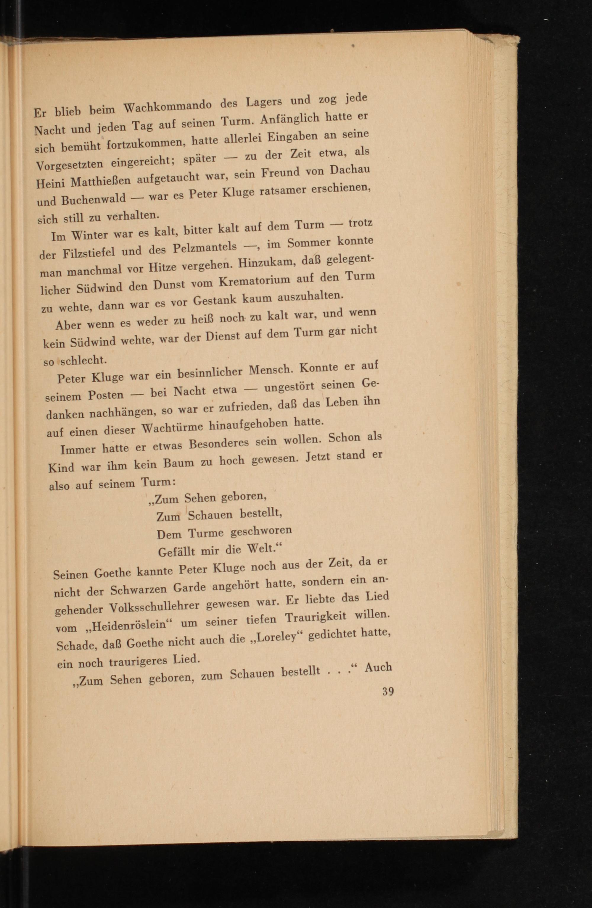 Gefällt mir die Welt.” Seinen Goethe kannte Peter Kluge noch aus der Zeit, da er nicht der Schwarzen Garde angehört hatte, sondern ein an- gehender Volksschullehrer gewesen wär. Er liebte das Lied vom„Heidenröslein um seiner tiefen Traurigkeit willen. Schade, daß Goethe nicht auch die Loreley ‘ gedichtet hatte, ein noch traurigeres Lied.