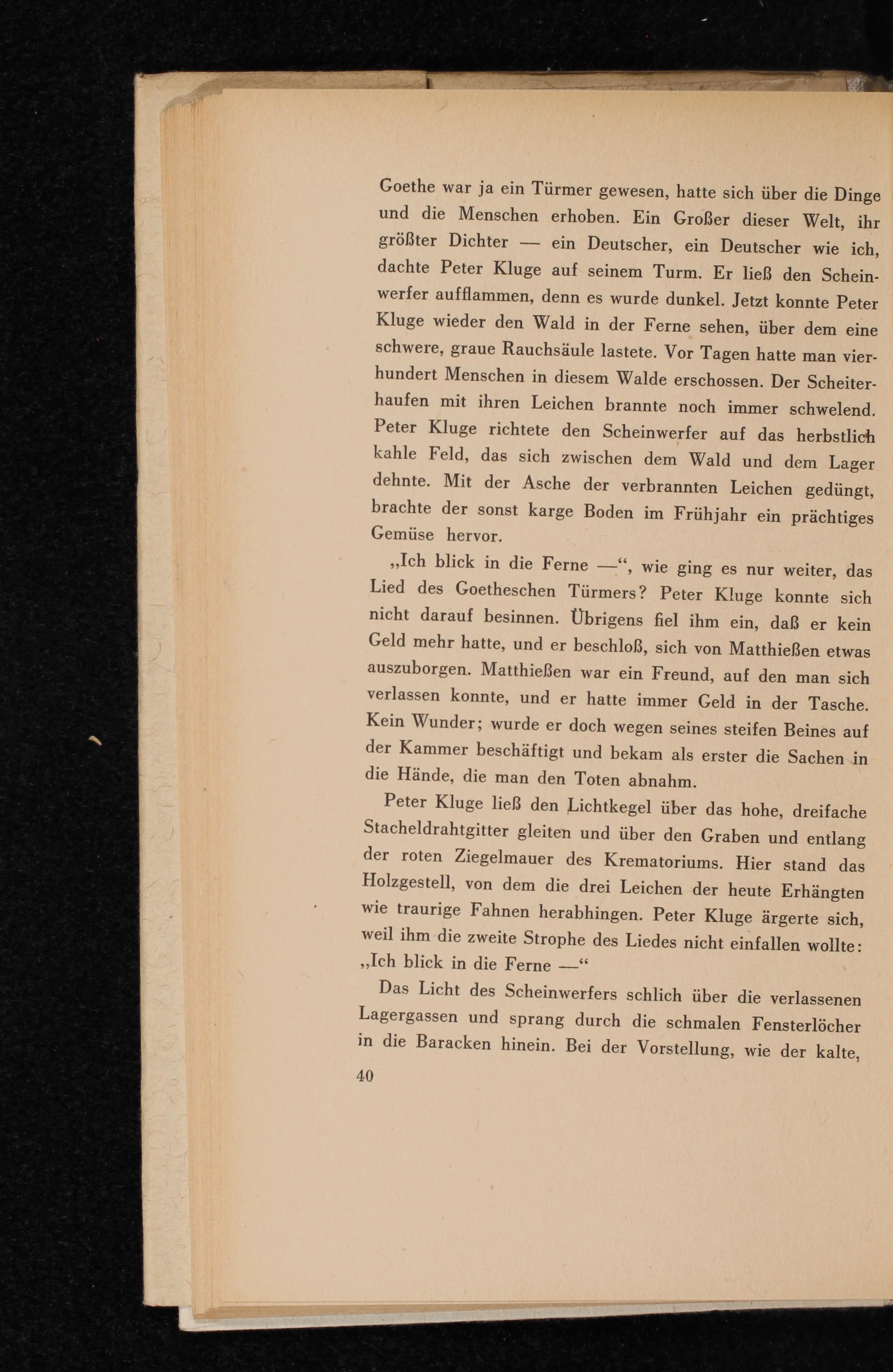 Goethe war ja ein Türmer gewesen, hatte sich über die Dinge und die Menschen erhoben. Ein Großer dieser Welt, ihr größter Dichter ein Deutscher, ein Deutscher wie ich, dachte Peter Kluge auf seinem Turm. Er ließ den Scheinwerfer aufflammen, denn es wurde dunkel. Jetzt konnte Peter Kluge wieder den Wald in der Ferne sehen, über dem eine schwere, graue Rauchsäule lastete. Vor Tagen hatte man vierhundert Menschen in diesem Walde erschossen. Der Scheiterhaufen mit ihren Leichen brannte noch immer schwelend. Peter Kluge richtete den Scheinwerfer auf das herbstlich kahle Feld, das sich zwischen dem Wald und dem Lager dehnte. Mit der Asche der verbrannten Leichen gedüngt, brachte der sonst karge Boden im Frühjahr ein prächtiges Gemüse hervor.