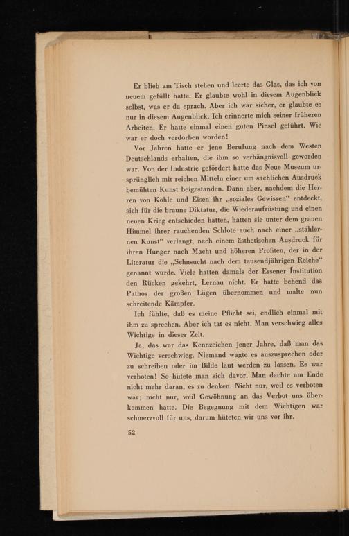Vor Jahren hatte er jene Berufung nach dem Westen Deutschlands erhalten, die ihm so verhängnisvoll geworden war. Von der Industrie gefördert hatte das Neue Museum ursprünglich mit reichen Mitteln einer um sachlichen Ausdruck bemühten Kunst beigestanden. Dann aber, nachdem die Herren von Kohle und Eisen ihr ,, soziales Gewissen" entdeckt, sich für die braune Diktatur, die Wiederaufrüstung und einen neuen Krieg entschieden hatten, hatten sie unter dem grauen Himmel ihrer rauchenden Schlote auch nach einer ,, stählernen Kunst" verlangt, nach einem ästhetischen Ausdruck für ihren Hunger nach Macht und höheren Profiten, der in der Literatur die ,, Sehnsucht nach dem tausendjährigen Reiche" genannt wurde. Viele hatten damals der Essener Institution den Rücken gekehrt, Lernau nicht. Er hatte behend das Pathos der großen Lügen übernommen und malte nun schreitende Kämpfer.