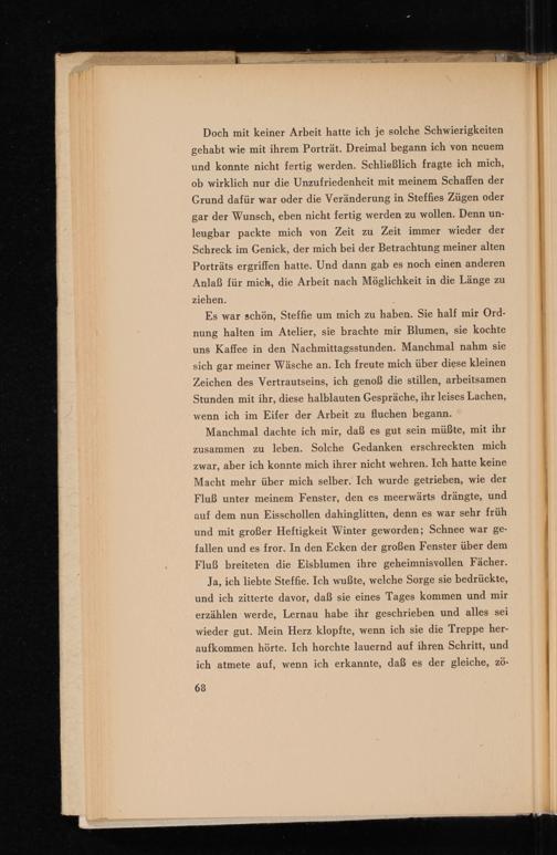 Doch mit keiner Arbeit hatte ich je solche Schwierigkeiten gehabt wie mit ihrem Porträt. Dreimal begann ich von neuem und konnte nicht fertig werden. Schließlich fragte ich mich, ob wirklich nur die Unzufriedenheit mit meinem Schaffen der Grund dafür war oder die Veränderung in Steffies Zügen oder gar der Wunsch, eben nicht fertig werden zu wollen. Denn unleugbar packte mich von Zeit zu Zeit immer wieder der Schreck im Genick, der mich bei der Betrachtung meiner alten Porträts ergriffen hatte. Und dann gab es noch einen anderen Anlaß für mich, die Arbeit nach Möglichkeit in die Länge zu ziehen.