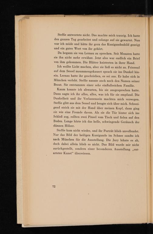 Steffie kam nicht wieder, und ihr Porträt blieb unvollendet. Nur das Bild der heiligen Kunigunde im Schnee sandte ich nach München für die Ausstellung. Die Jury lehnte es ab, doch dabei allein blieb es nicht. Das Bild wurde mir nicht zurückgestellt, sondern einer besonderen Ausstellung ,, entarteter Kunst" überwiesen.