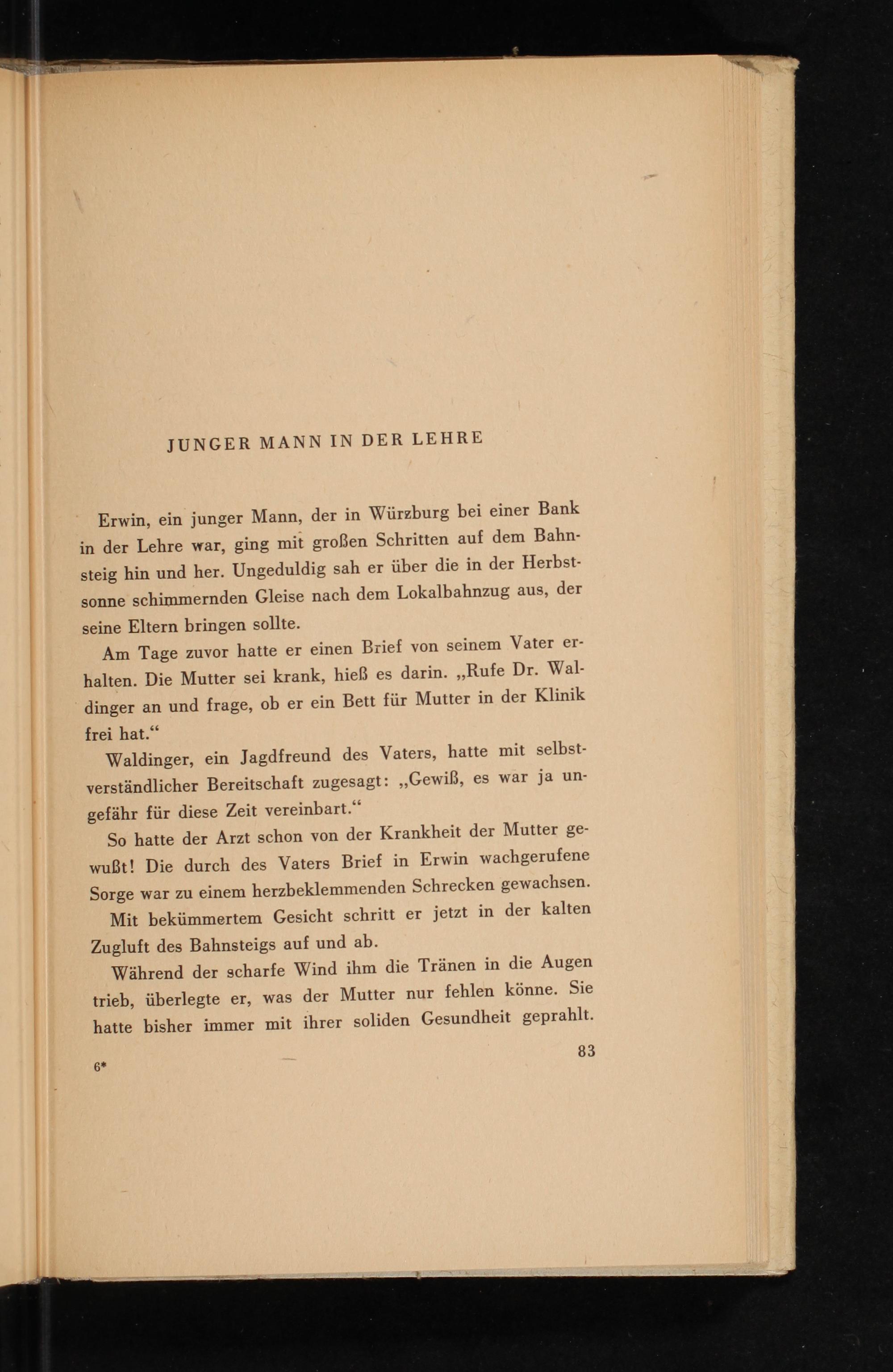 Erwin, ein junger Mann, der in Würzburg bei einer Bank in der Lehre war, ging mit großen Schritten auf dem Bahnsteig hin und her. Ungeduldig sah er über die in der Herbstsonne schimmernden Gleise nach dem Lokalbahnzug aus, der seine Eltern bringen sollte.