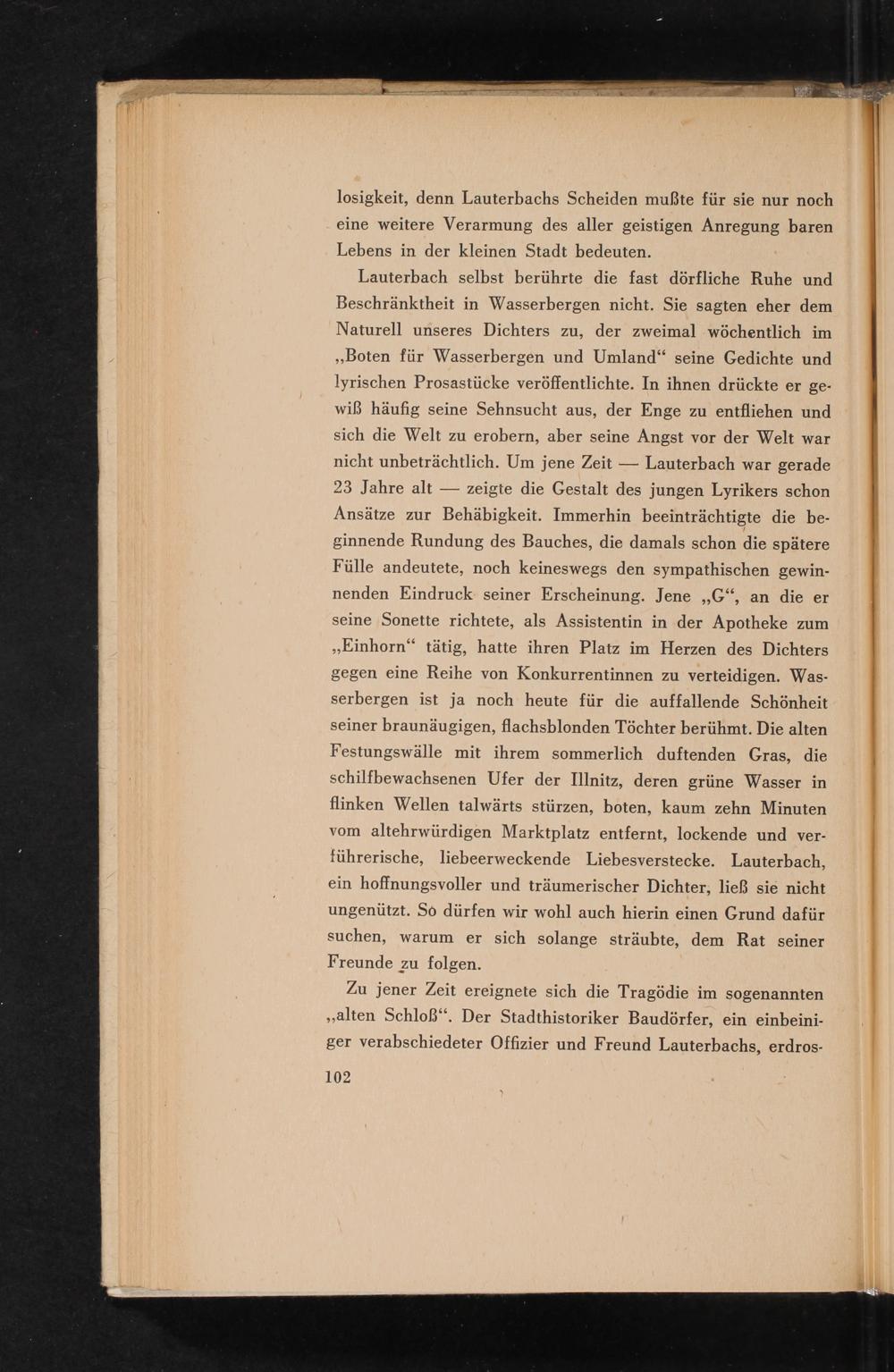 Lauterbach selbst berührte die fast dörfliche Ruhe und Beschränktheit in Wasserbergen nicht. Sie sagten eher dem Naturell unseres Dichters zu, der zweimal wöchentlich im ,, Boten für Wasserbergen und Umland" seine Gedichte und lyrischen Prosastücke veröffentlichte. In ihnen drückte er gewiẞ häufig seine Sehnsucht aus, der Enge zu entfliehen und sich die Welt zu erobern, aber seine Angst vor der Welt war nicht unbeträchtlich. Um jene Zeit Lauterbach war gerade 23 Jahre alt zeigte die Gestalt des jungen Lyrikers schon Ansätze zur Behäbigkeit. Immerhin beeinträchtigte die beginnende Rundung des Bauches, die damals schon die spätere Fülle andeutete, noch keineswegs den sympathischen gewinnenden Eindruck seiner Erscheinung. Jene ,, G", an die er seine Sonette richtete, als Assistentin in der Apotheke zum ,, Einhorn" tätig, hatte ihren Platz im Herzen des Dichters gegen eine Reihe von Konkurrentinnen zu verteidigen. Wasserbergen ist ja noch heute für die auffallende Schönheit seiner braunäugigen, flachsblonden Töchter berühmt. Die alten Festungswälle mit ihrem sommerlich duftenden Gras, die schilfbewachsenen Ufer der Illnitz, deren grüne Wasser in flinken Wellen talwärts stürzen, boten, kaum zehn Minuten vom altehrwürdigen Marktplatz entfernt, lockende und verführerische, liebeerweckende Liebesverstecke. Lauterbach, ein hoffnungsvoller und träumerischer Dichter, ließ sie nicht ungenützt. So dürfen wir wohl auch hierin einen Grund dafür suchen, warum er sich solange sträubte, dem Rat seiner Freunde zu folgen.