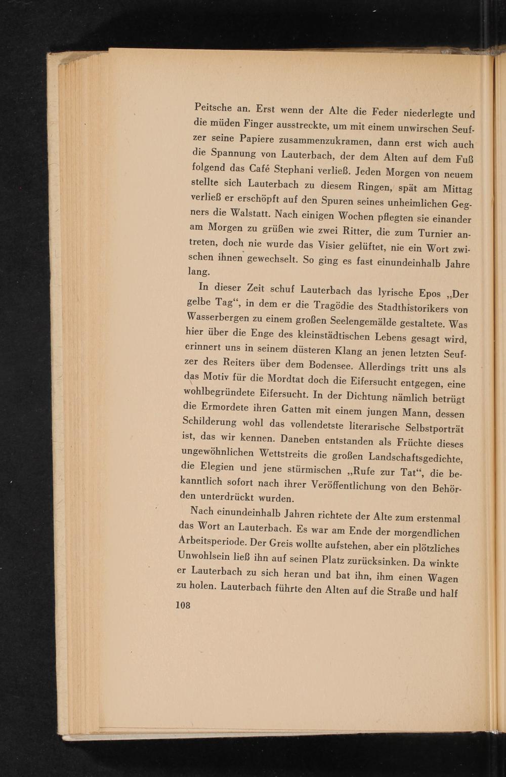 In dieser Zeit schuf Lauterbach das lyrische Epos ,, Der gelbe Tag", in dem er die Tragödie des Stadthistorikers von Wasserbergen zu einem großen Seelengemälde gestaltete. Was hier über die Enge des kleinstädtischen Lebens gesagt wird, erinnert uns in seinem düsteren Klang an jenen letzten Seufzer des Reiters über dem Bodensee . Allerdings tritt uns als das Motiv für die Mordtat doch die Eifersucht entgegen, eine wohlbegründete Eifersucht. In der Dichtung nämlich betrügt die Ermordete ihren Gatten mit einem jungen Mann, dessen Schilderung wohl das vollendetste literarische Selbstporträt ist, das wir kennen. Daneben entstanden als Früchte dieses ungewöhnlichen Wettstreits die großen Landschaftsgedichte, die Elegien und jene stürmischen ,, Rufe zur Tat", die bekanntlich sofort nach ihrer Veröffentlichung von den Behörden unterdrückt wurden.