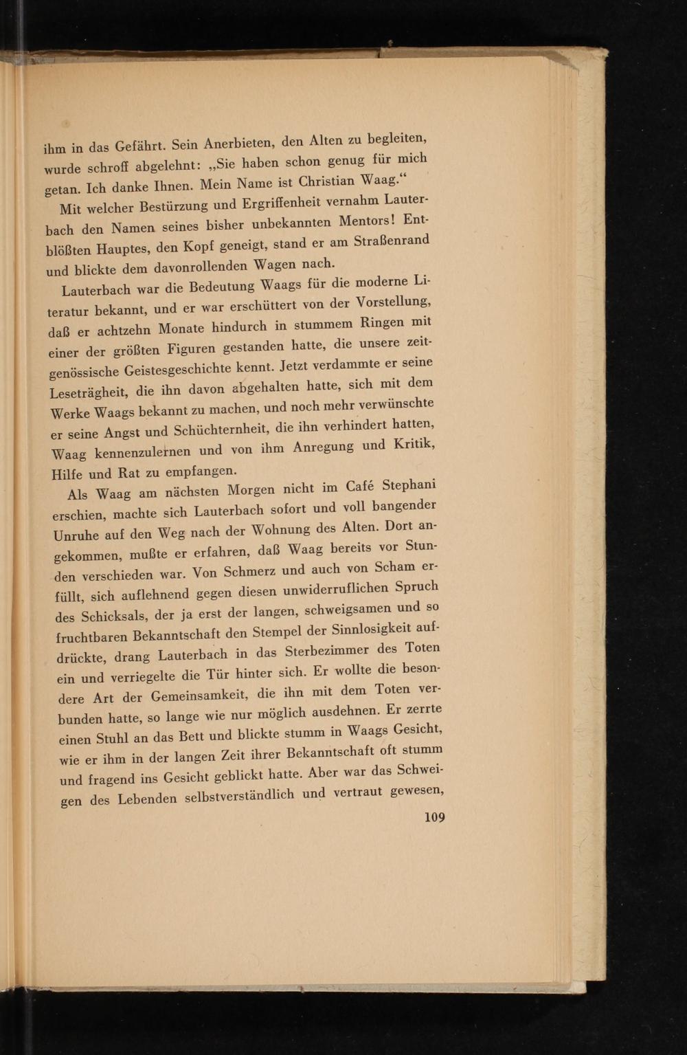 Lauterbach war die Bedeutung Waags für die moderne Literatur bekannt, und er war erschüttert von der Vorstellung, daß er achtzehn Monate hindurch in stummem Ringen mit einer der größten Figuren gestanden hatte, die unsere zeitgenössische Geistesgeschichte kennt. Jetzt verdammte er seine Leseträgheit, die ihn davon abgehalten hatte, sich mit dem Werke Waags bekannt zu machen, und noch mehr verwünschte er seine Angst und Schüchternheit, die ihn verhindert hatten, Waag kennenzulernen und von ihm Anregung und Kritik, Hilfe und Rat zu empfangen.