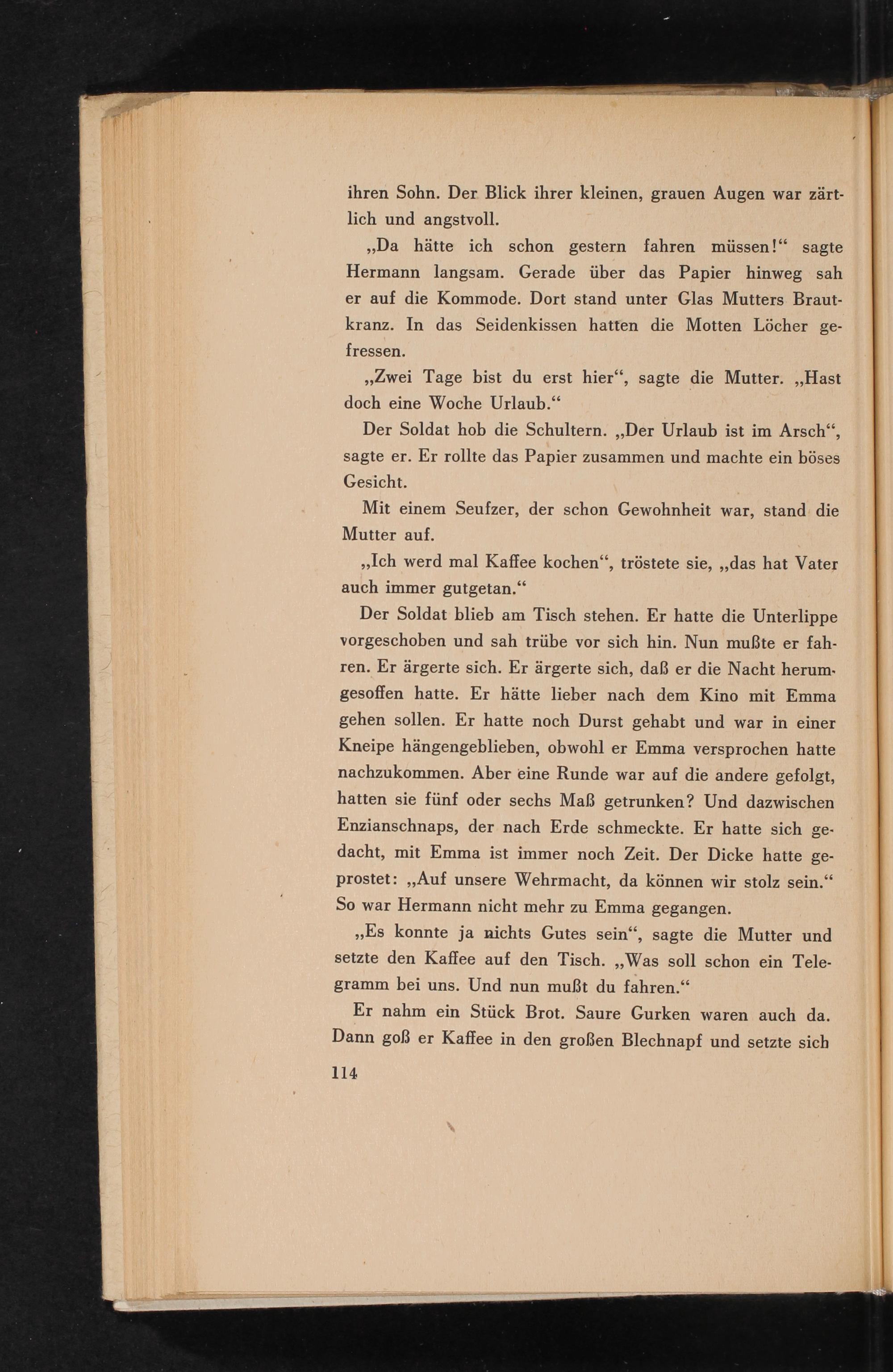 Der Soldat blieb am Tisch stehen. Er hatte die Unterlippe vorgeschoben und sah trübe vor sich hin. Nun mußte er fahren. Er ärgerte sich. Er ärgerte sich, daß er die Nacht herumgesoffen hatte. Er hätte lieber nach dem Kino mit Emma gehen sollen. Er hatte noch Durst gehabt und war in einer Kneipe hängengeblieben, obwohl er Emma versprochen hatte nachzukommen. Aber eine Runde war auf die andere gefolgt, hatten sie fünf oder sechs Maß getrunken? Und dazwischen Enzianschnaps, der nach Erde schmeckte. Er hatte sich gedacht, mit Emma ist immer noch Zeit. Der Dicke hatte geprostet: ,, Auf unsere Wehrmacht, da können wir stolz sein." So war Hermann nicht mehr zu Emma gegangen.