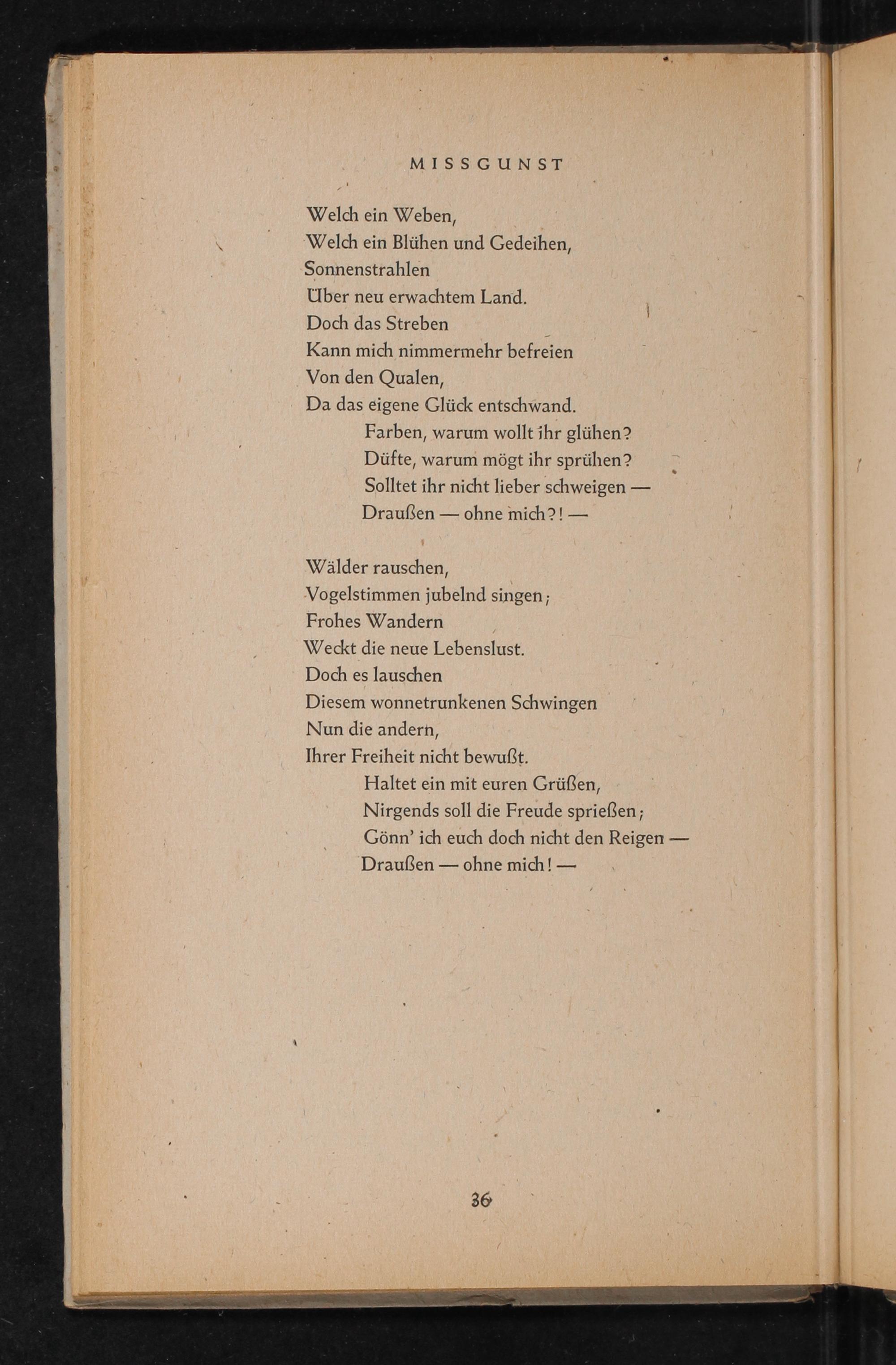 Da das eigene Glück entschwand. Farben, warum wollt ihr glühen? Düfte, warum mögt ihr sprühen? Solltet ihr nicht lieber schweigen— Draußen— ohne mich?!—