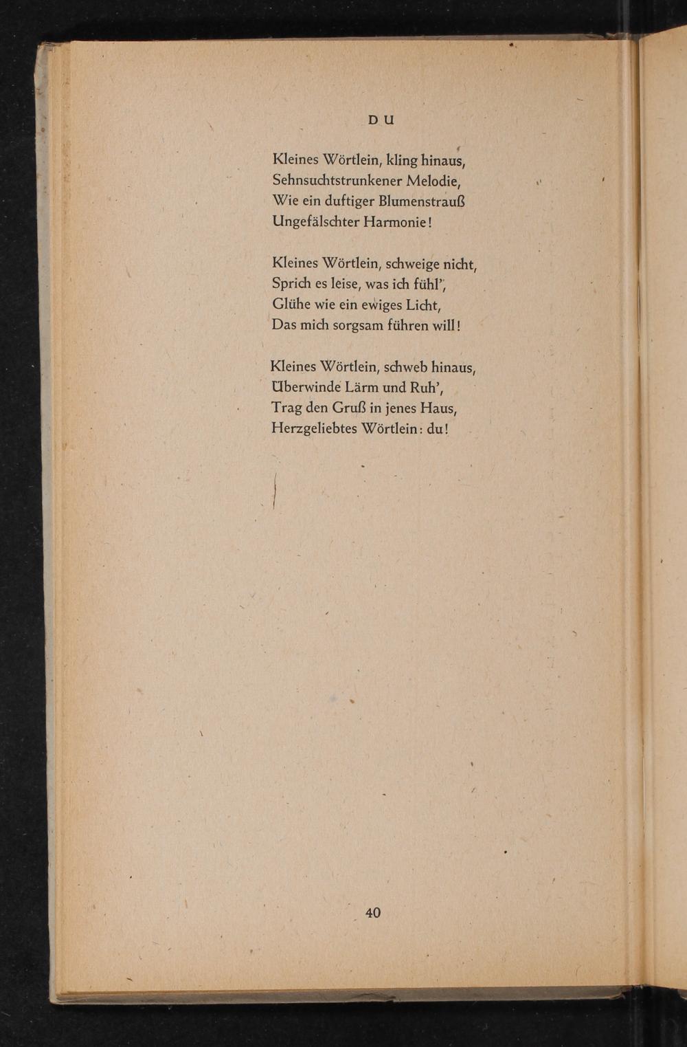 Kleines Wörtlein, schweb hinaus, Überwinde Lärm und Ruh', Trag den Gruß in jenes Haus, Herzgeliebtes Wörtlein: du!