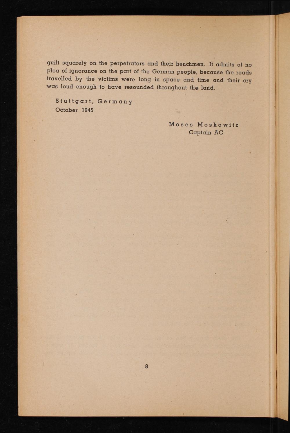 guilt squarely on the perpetrators and their henchmen. It admits of no plea of ignorance on the part of the German people, because the roads travelled by the victims were long in space and time and their cry was loud enough to have resounded throughout the land.