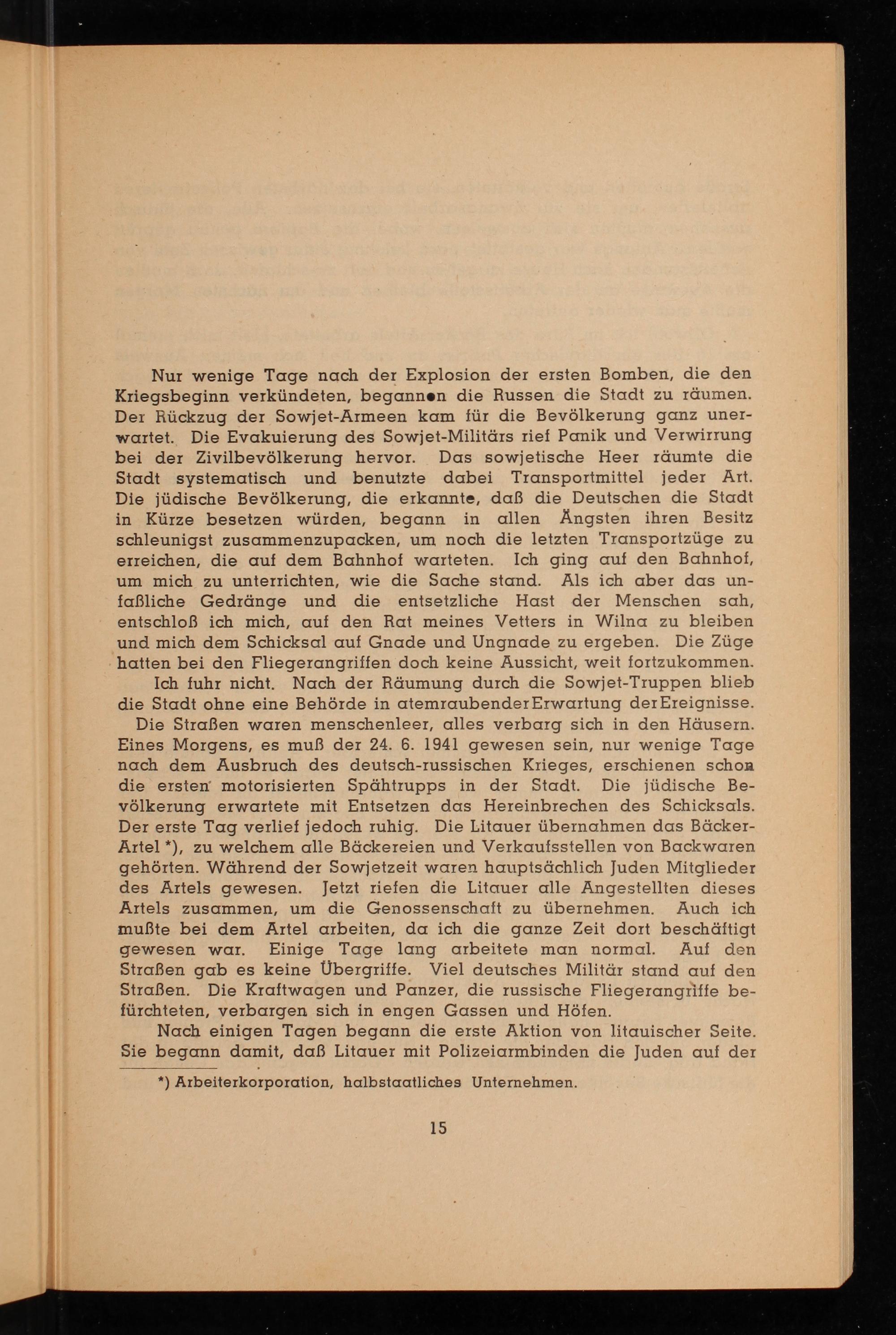 Nur wenige Tage nach der Explosion der ersten Bomben, die den Kriegsbeginn verkündeten, begannen die Russen die Stadt zu räumen. Der Rückzug der Sowjet- Armeen kam für die Bevölkerung ganz unerwartet. Die Evakuierung des Sowjet- Militärs rief Panik und Verwirrung bei der Zivilbevölkerung hervor. Das sowjetische Heer räumte die Stadt systematisch und benutzte dabei Transportmittel jeder Art. Die jüdische Bevölkerung, die erkannte, daß die Deutschen die Stadt in Kürze besetzen würden, begann in allen Ängsten ihren Besitz schleunigst zusammenzupacken, um noch die letzten Transportzüge zu erreichen, die auf dem Bahnhof warteten. Ich ging auf den Bahnhof, um mich zu unterrichten, wie die Sache stand. Als ich aber das unfaẞliche Gedränge und die entsetzliche Hast der Menschen sah, entschloß ich mich, auf den Rat meines Vetters in Wilna zu bleiben und mich dem Schicksal auf Gnade und Ungnade zu ergeben. Die Züge hatten bei den Fliegerangriffen doch keine Aussicht, weit fortzukommen. Ich fuhr nicht. Nach der Räumung durch die Sowjet- Truppen blieb die Stadt ohne eine Behörde in atemraubender Erwartung der Ereignisse. Die Straßen waren menschenleer, alles verbarg sich in den Häusern. Eines Morgens, es muß der 24. 6. 1941 gewesen sein, nur wenige Tage nach dem Ausbruch des deutsch - russischen Krieges, erschienen schon die ersten motorisierten Spähtrupps in der Stadt. Die jüdische Bevölkerung erwartete mit Entsetzen das Hereinbrechen des Schicksals. Der erste Tag verlief jedoch ruhig. Die Litauer übernahmen das BäckerArtel*), zu welchem alle Bäckereien und Verkaufsstellen von Backwaren gehörten. Während der Sowjetzeit waren hauptsächlich Juden Mitglieder des Artels gewesen. Jetzt riefen die Litauer alle Angestellten dieses Artels zusammen, um die Genossenschaft zu übernehmen. Auch ich mußte bei dem Artel arbeiten, da ich die ganze Zeit dort beschäftigt gewesen war. Einige Tage lang arbeitete man normal. Auf den Straßen gab es keine Übergriffe. Viel deutsches Militär stand auf den Straßen. Die Kraftwagen und Panzer, die russische Fliegerangriffe befürchteten, verbargen sich in engen Gassen und Höfen.