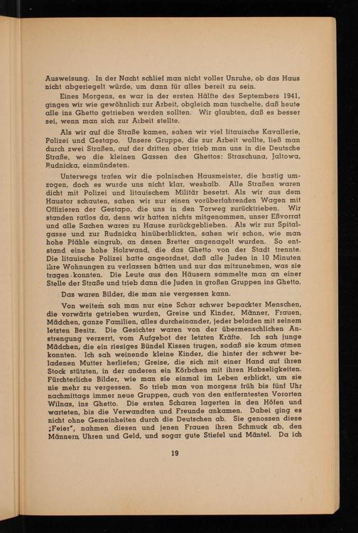 Von weitem sah man nur eine Schar schwer bepackter Menschen, die vorwärts getrieben wurden, Greise und Kinder, Männer, Frauen, Mädchen, ganze Familien, alles durcheinander, jeder beladen mit seinem letzten Besitz. Die Gesichter waren von der übermenschlichen AnIch sah junge strengung verzerrt, vom Aufgebot der letzten Kräfte. Mädchen, die ein riesiges Bündel Kissen trugen, sodaß sie kaum atmen konnten. Ich sah weinende kleine Kinder, die hinter der schwer beladenen Mutter herliefen; Greise, die sich mit einer Hand auf ihren Stock stützten, in der anderen ein Körbchen mit ihren Habseligkeiten. Fürchterliche Bilder, wie man sie einmal im Leben erblickt, um sie nie mehr zu vergessen. So trieb man von morgens früh bis fünf Uhr nachmittags immer neue Gruppen, auch von den entferntesten Vororten Wilnas, ins Ghetto. Die ersten Scharen lagerten in den Höfen und warteten, bis die Verwandten und Freunde ankamen. Dabei ging es nicht ohne Gemeinheiten durch die Deutschen ab. Sie genossen diese Feier", nahmen diesen und jenen Frauen ihren Schmuck ab, den Männern, Uhren und Geld, und sogar gute Stiefel und Mäntel. Da ich