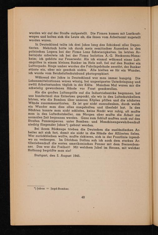 In Deutschland teilte ich drei Jahre lang das Schicksal aller Deportierten. Mehrfach hatte ich durch mein semitisches Aussehen in den polnischen Lagern bei der Firma Lanz Schwierigkeiten. Im letzten Arbeitsjahr arbeitete ich bei der Firma Isolation A.-G. Neckarau- Mannheim ; ich gehörte zur Feuerwehr. Als ich einmal während eines Luftangriffes in einem kleinen Bunker im Hofe saß, fiel auf den Bunker ein Lufttorpedo. Rings umher wurden die Fabrikgebäude zerstört, der Bunker stürzte ein, aber mir geschah nichts. Alle hielten es für ein Wunder, ich wurde vom Reichsluftschutzbund photographiert.