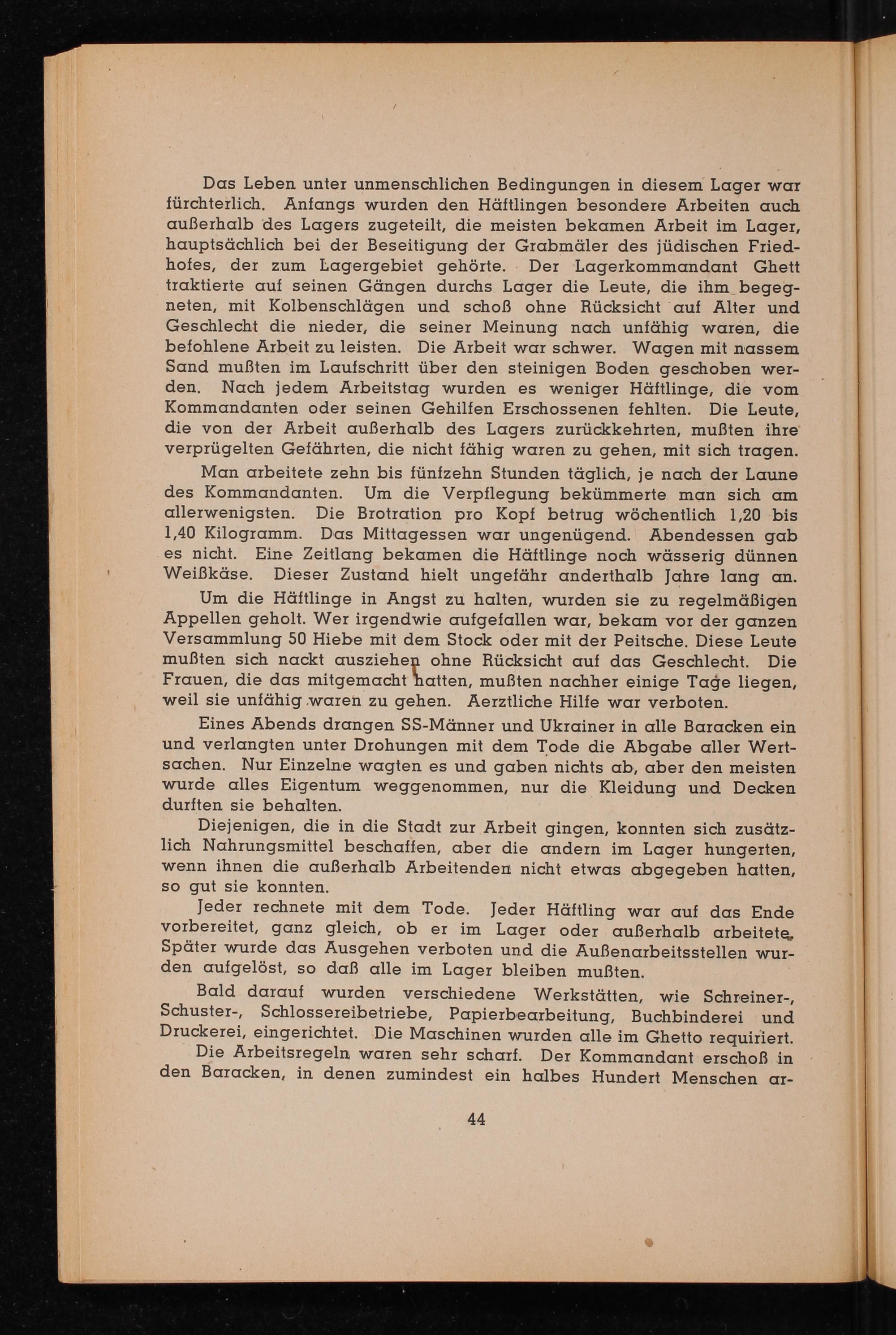 Das Leben unter unmenschlichen Bedingungen in diesem Lager war fürchterlich. Anfangs wurden den Häftlingen besondere Arbeiten auch außerhalb des Lagers zugeteilt, die meisten bekamen Arbeit im Lager, hauptsächlich bei der Beseitigung der Grabmäler des jüdischen Friedhofes, der zum Lagergebiet gehörte. Der Lagerkommandant Ghett traktierte auf seinen Gängen durchs Lager die Leute, die ihm begegneten, mit Kolbenschlägen und schoẞ ohne Rücksicht auf Alter und Geschlecht die nieder, die seiner Meinung nach unfähig waren, die befohlene Arbeit zu leisten. Die Arbeit war schwer. Wagen mit nassem Sand mußten im Laufschritt über den steinigen Boden geschoben werden. Nach jedem Arbeitstag wurden es weniger Häftlinge, die vom Kommandanten oder seinen Gehilfen Erschossenen fehlten. Die Leute, die von der Arbeit außerhalb des Lagers zurückkehrten, mußten ihre verprügelten Gefährten, die nicht fähig waren zu gehen, mit sich tragen.