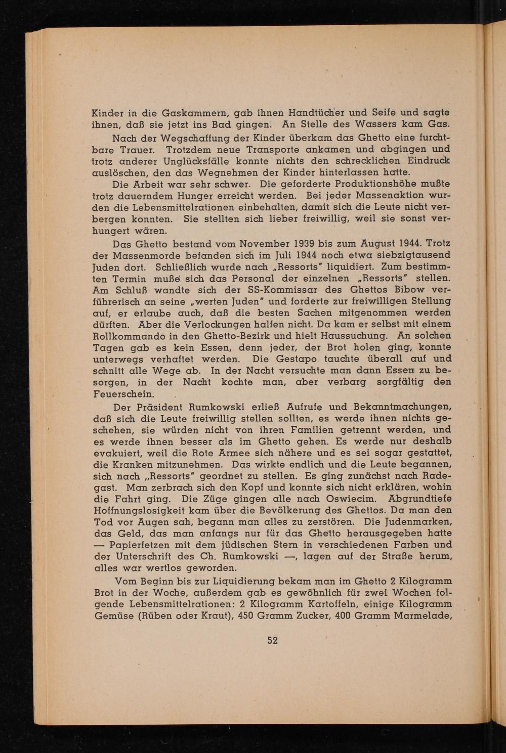 Der Präsident Rumkowski erließ Aufrufe und Bekanntmachungen, daß sich die Leute freiwillig stellen sollten, es werde ihnen nichts geschehen, sie würden nicht von ihren Familien getrennt werden, und es werde ihnen besser als im Ghetto gehen. Es werde nur deshalb evakuiert, weil die Rote Armee sich nähere und es sei sogar gestattet, die Kranken mitzunehmen. Das wirkte endlich und die Leute begannen, sich nach ,, Ressorts" geordnet zu stellen. Es ging zunächst nach Radegast. Man zerbrach sich den Kopf und konnte sich nicht erklären, wohin die Fahrt ging. Die Züge gingen alle nach Oswiecim . Abgrundtiefe Hoffnungslosigkeit kam über die Bevölkerung des Ghettos. Da man den Tod vor Augen sah, begann man alles zu zerstören. Die Judenmarken, das Geld, das man anfangs nur für das Ghetto herausgegeben hatte - Papierfetzen mit dem jüdischen Stern in verschiedenen Farben und der Unterschrift des Ch. Rumkowski-, lagen auf der Straße herum, alles war wertlos geworden.