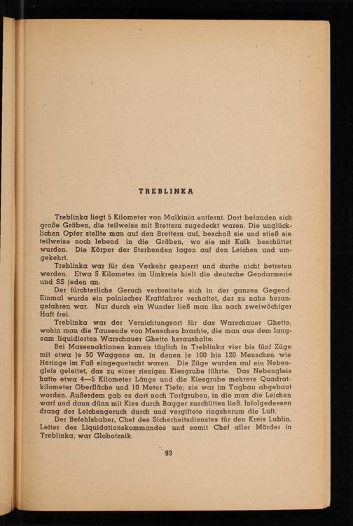 Treblinka liegt 5 Kilometer von Malkinia entfernt. Dort befanden sich große Gräben, die teilweise mit Brettern zugedeckt waren. Die unglücklichen Opfer stellte man auf den Brettern auf, beschoß sie und stieß sie teilweise noch lebend in die Gräben, wo sie mit Kalk beschüttet wurden. Die Körper der Sterbenden lagen auf den Leichen und umgekehrt.