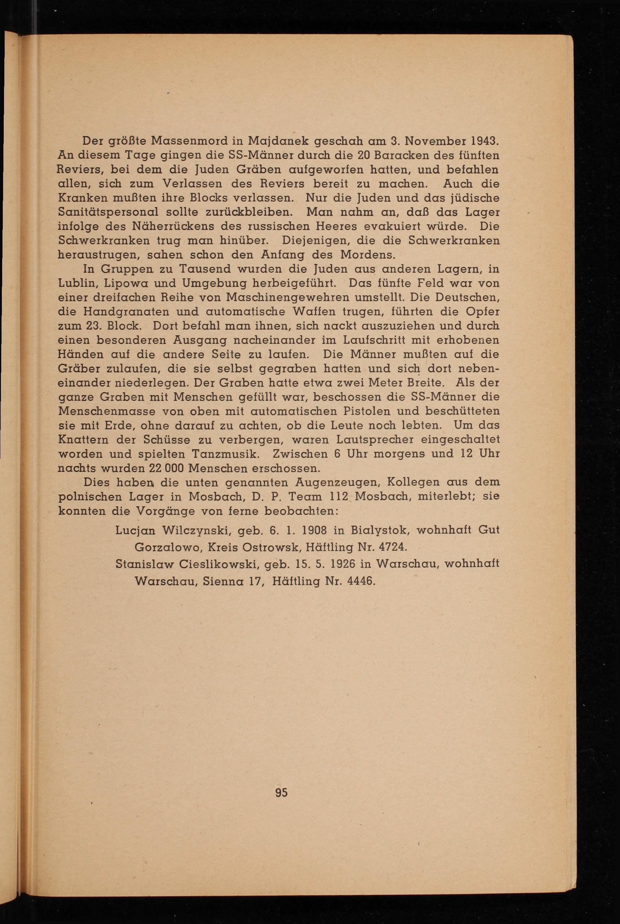Der größte Massenmord in Majdanek geschah am 3. November 1943. An diesem Tage gingen die SS -Männer durch die 20 Baracken des fünften Reviers, bei dem die Juden Gräben aufgeworfen hatten, und befahlen allen, sich zum Verlassen des Reviers bereit zu machen. Auch die Kranken mußten ihre Blocks verlassen. Nur die Juden und das jüdische Sanitätspersonal sollte zurückbleiben. Man nahm an, daß das Lager infolge des Näherrückens des russischen Heeres evakuiert würde. Die Schwerkranken trug man hinüber. Diejenigen, die die Schwerkranken heraustrugen, sahen schon den Anfang des Mordens.